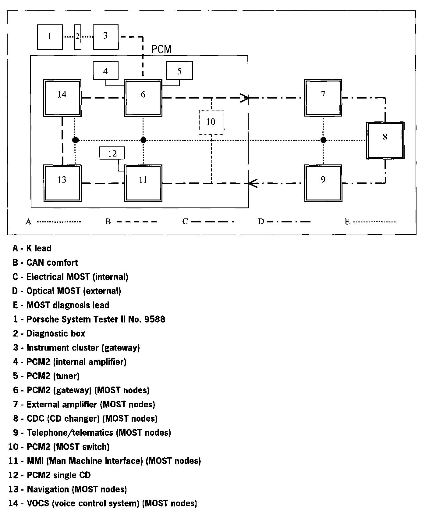 Communication between the Porsche System Tester II No. 9588 and the MOST control modules only takes place via the K lead to the instrument cluster. The data is transferred from the instrument cluster gateway to the MOST control units via CAN comfort to the CDR23 gateway and via the optical MOST outside the CDR23.