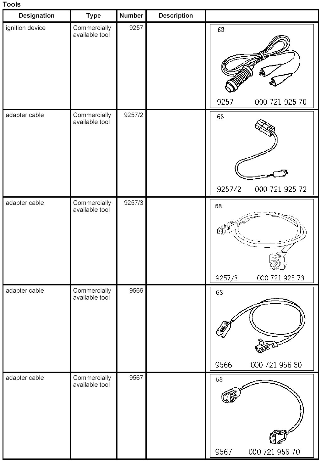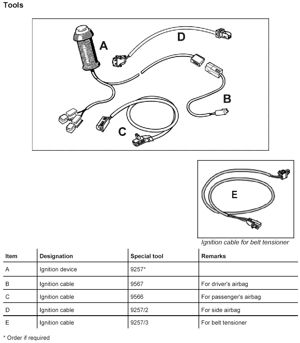 - If the vehicle had suffered fire damage which caused one or several airbags or the belt tensioner to be ignited, additional ignition with the ignition device 9257 must be carried out in order to ensure that only parts without pyrotechnical contents are scrapped.