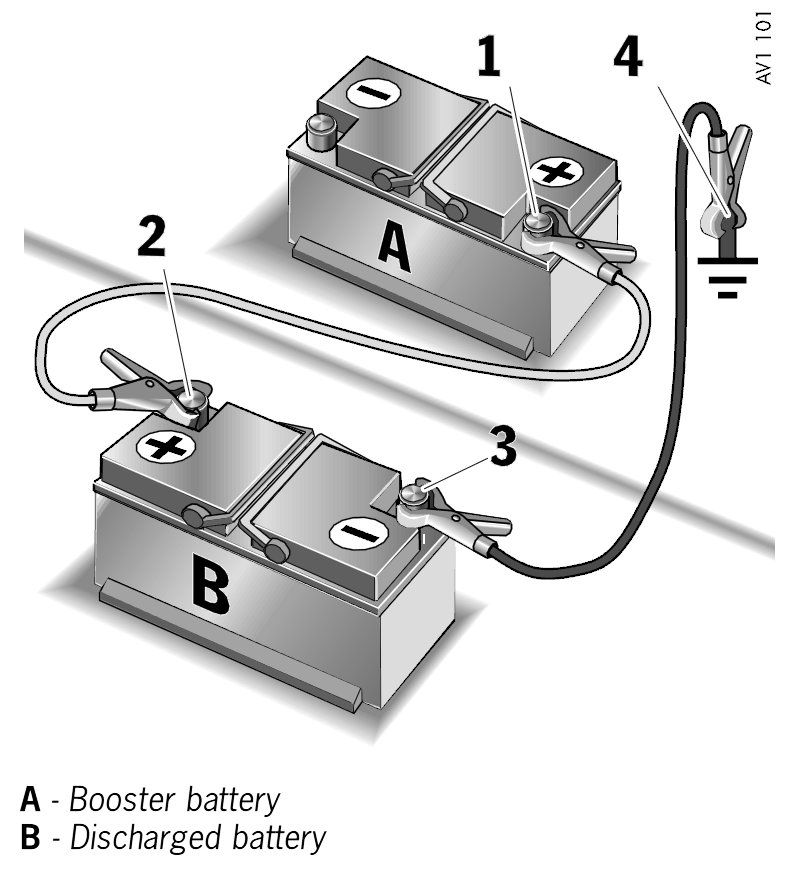 3. Attach the positive cable first to the positive terminal 1 of the booster battery A, then to the positive terminal 2 of the discharged battery B.