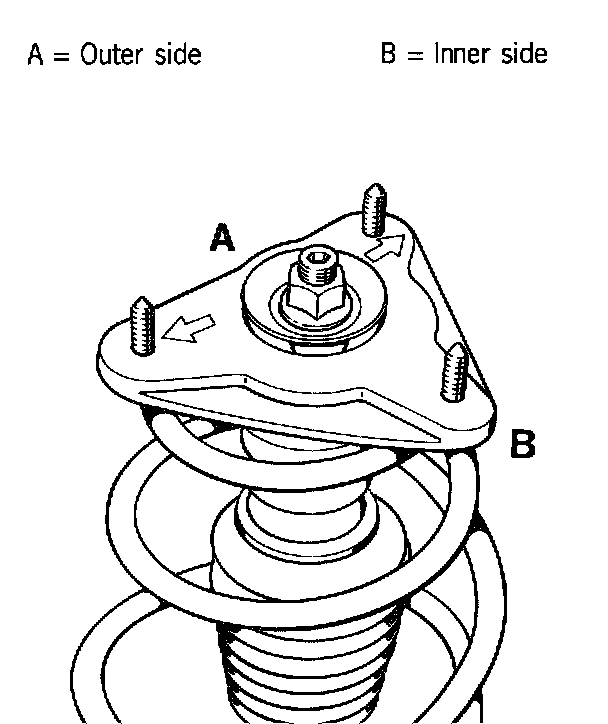 3. Insert spring strut into vehicle. Note the installed position of the spring strut mount. The arrow markings must point to the outer side of the vehicle (A). The shock-absorber piston rod is thereby shifted outwards. Use new fastening nuts. Before tightening the fastening nuts, adjust spring strut mount in accordance with the applied marking (position of the three collar nuts). Tightening torque 37 Nm (27 ft. lbs.).