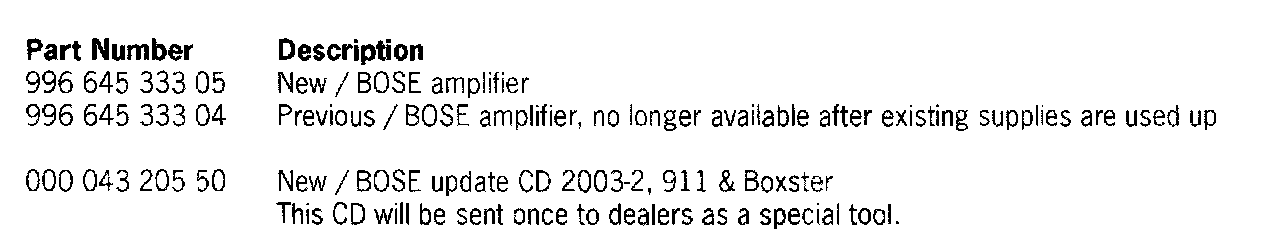In the event of a complaint, the software of the BOSE amplifier must be updated using the CD "BOSE Update-CD 2003-2; 911 & Boxster", part number, 000 043 205 50.