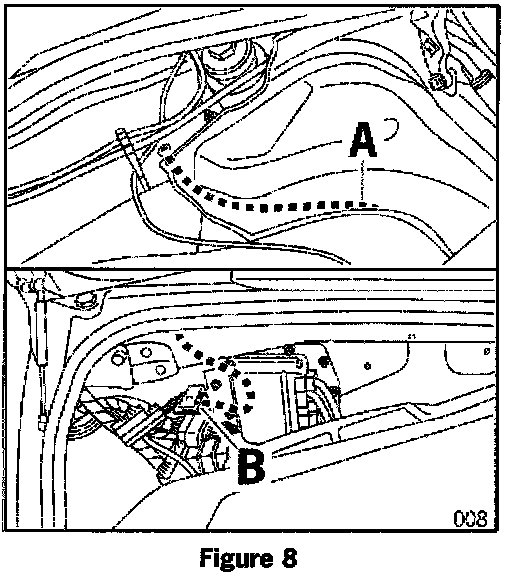 7.8 Route steel-armored hoses at the installation position of the vacuum modulators (A) and secure in the fastening clips (B).