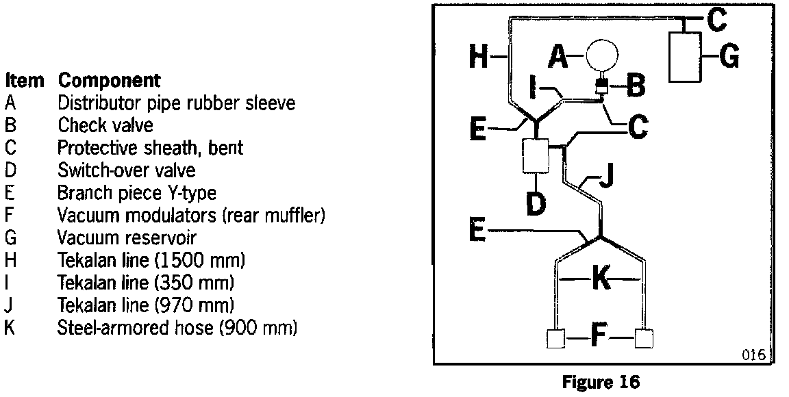 9. Fasten steel-armored hoses (Figure 16, Item K) on the vacuum modulators (Figure 16, Item F) using 6 mm hose clamps.