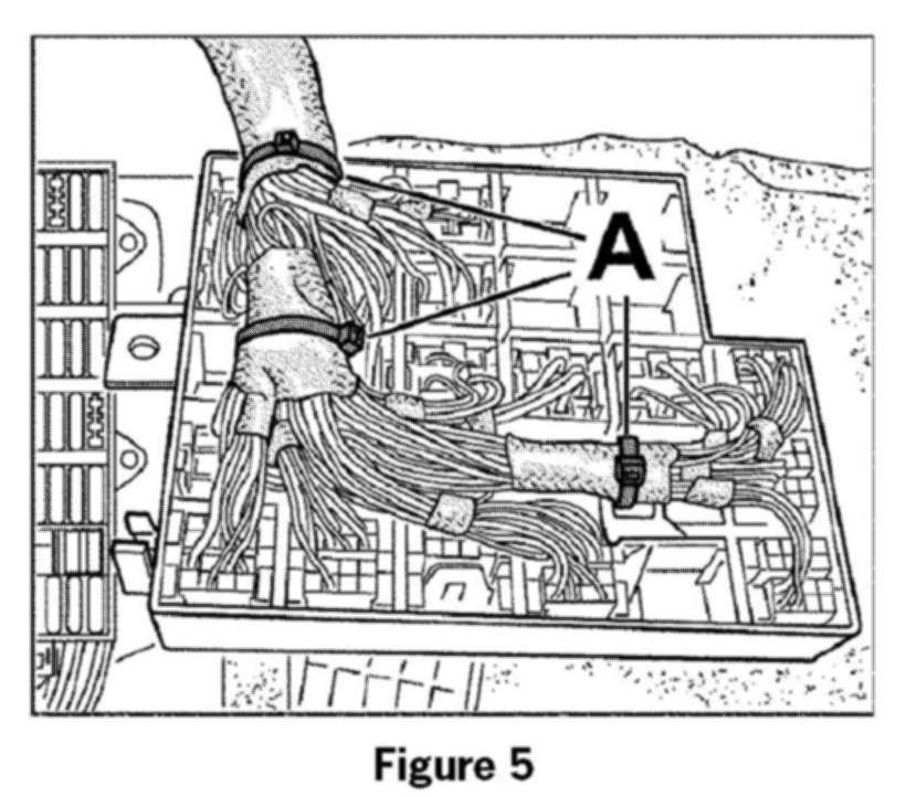 7. Turn relay carrier as shown in Figure 5, set aside, and cut through the 3 tie-wraps of the wiring harness (Figure 5, Item A) with side cutters and remove.