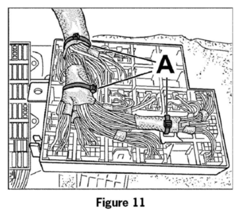 18. Turn relay carrier, set aside as shown in Figure 11 and fasten the wiring harness to the cable guides of the relay carrier using 3 tie-wraps (Figure 11, Item A).