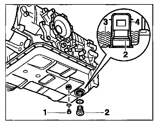 5. Unscrew filler screw -2-. If ATF escapes from the filler screw hole and if the ATF temperature is 30 degrees C to degrees C, the ATF level is in order.