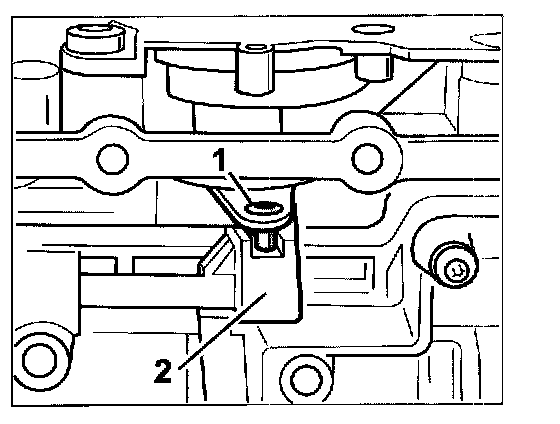 2. Carefully put on hydraulic control unit and insert the pin of the detent disk -1- into the groove of the selector valve -2-.