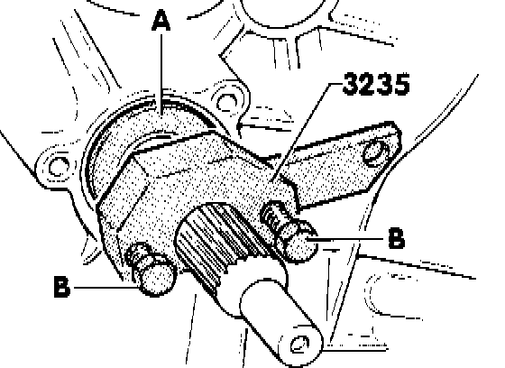 - Put the special tool 3235 behind the teeth for the clutch plate on the input shaft and pretension with the two screws - B -. Here, the screws support themselves in the two recesses of the pressure disc.