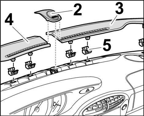 6.1. Lift the alarm readiness light -2- and unclip it to the rear. Lift the defroster covers on the left and right -3 and 4- and unclip them. Check fastening clips -5-, replace if necessary.