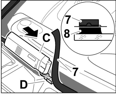 1.1. When removing remaining adhesive -7- with the cutting tool -C- and the flashing knife -D- on the body, ensure that a surface coating of adhesive remains -8-.