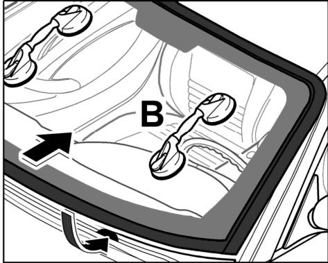 5.1. Apply suction cups -B- to the windscreen and insert the windscreen into the window aperture. Press the windscreen up as far as it will go. When doing so, press the lower edge of the glass against the spacer blocks.