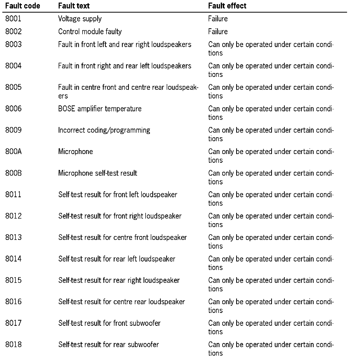 Fault overview - external BOSE amplifier