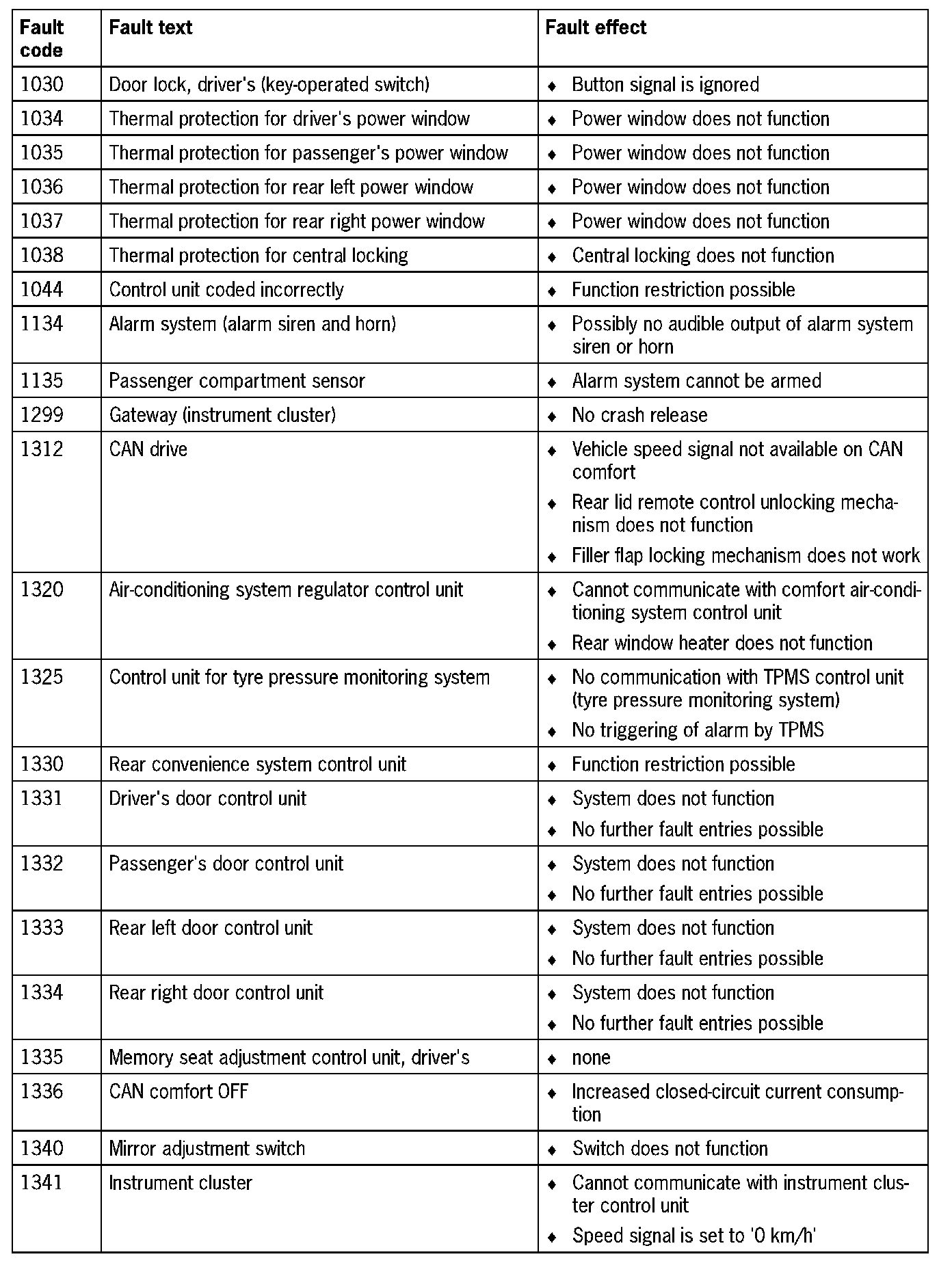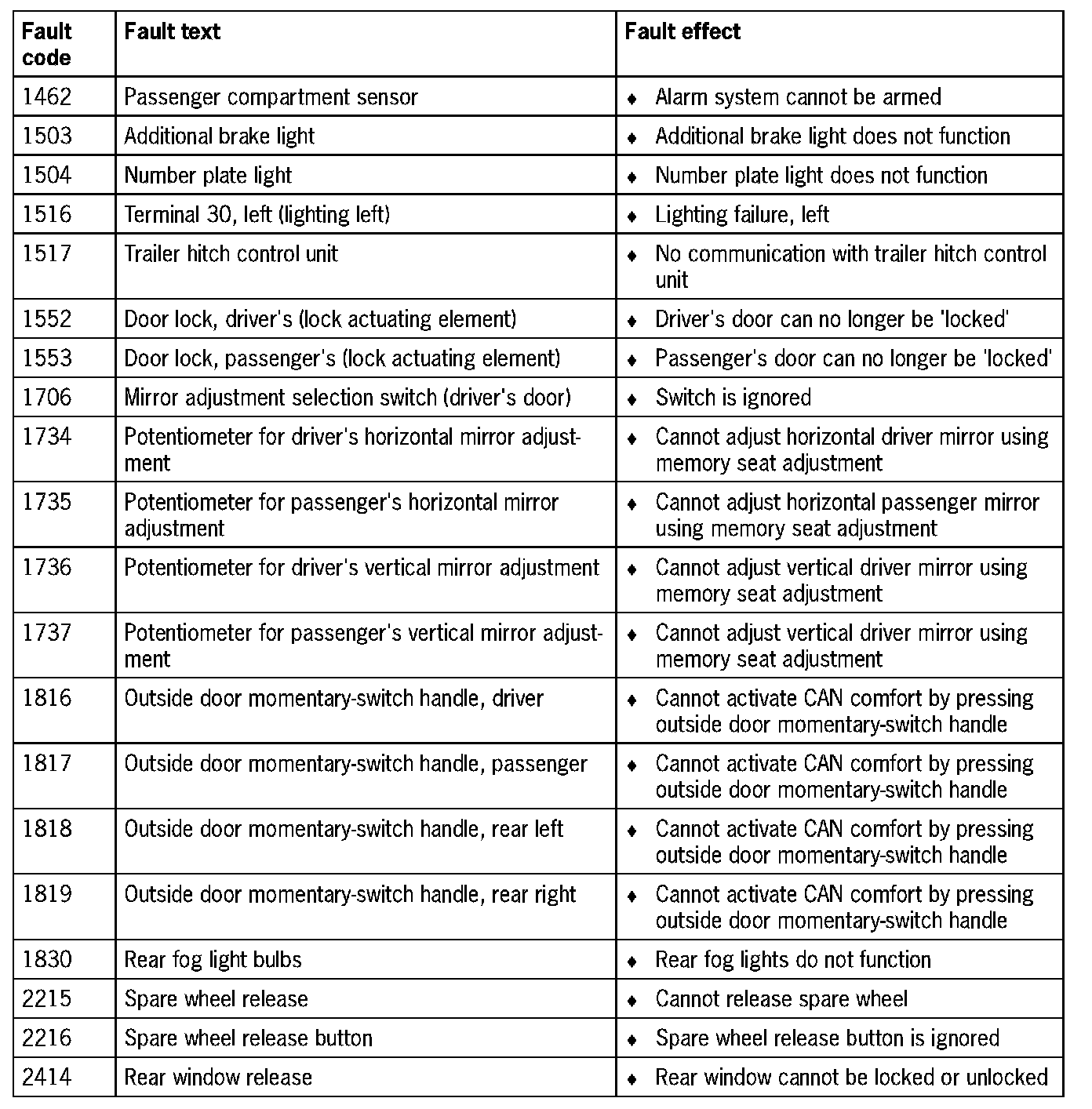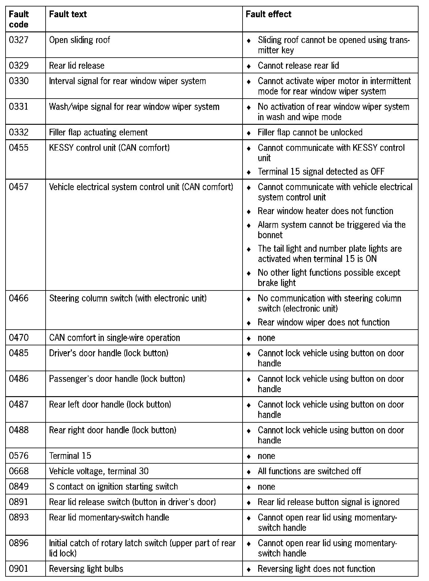 Fault Overview - Rear/Door Convenience System