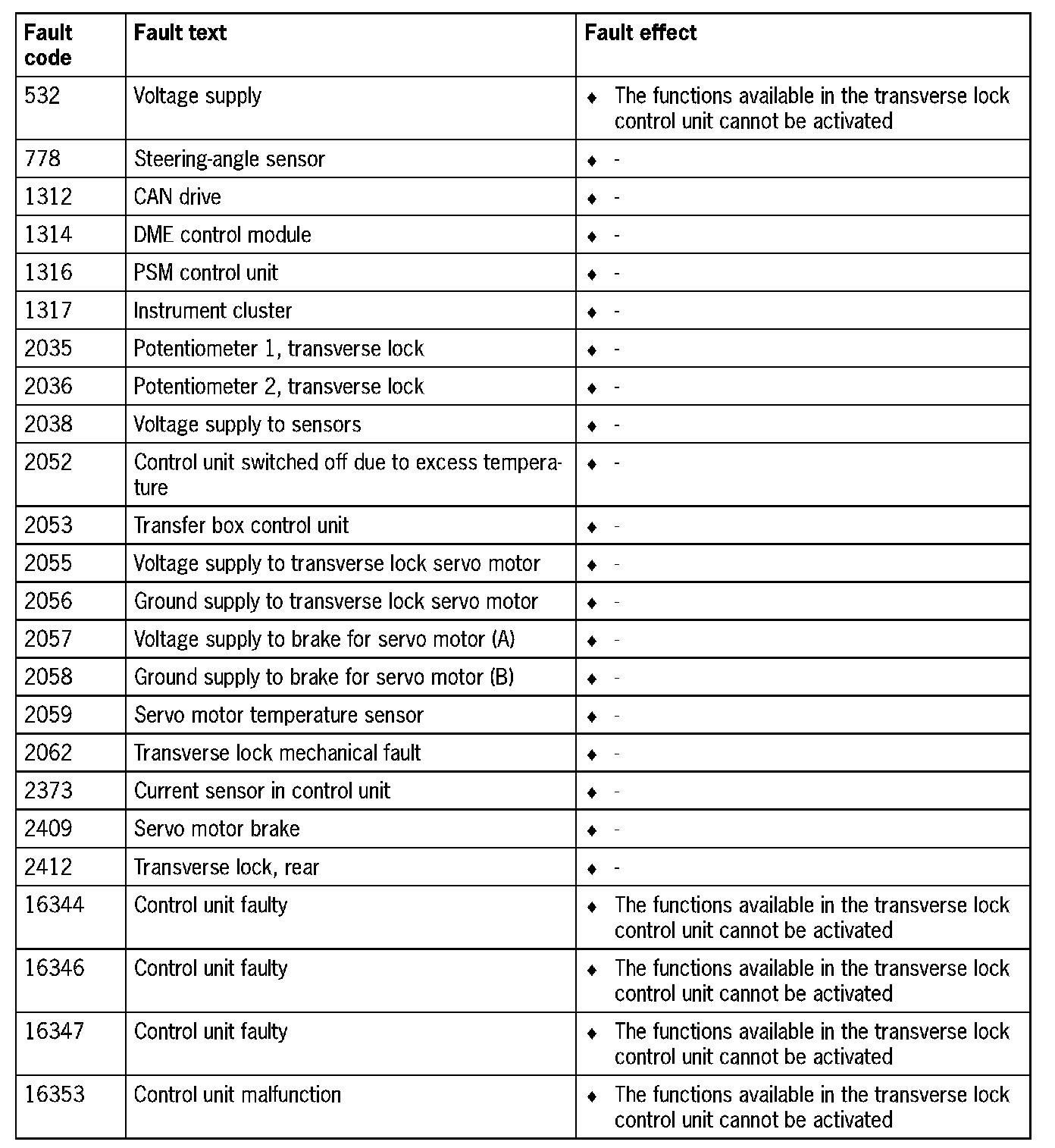 Fault Overview - Transverse Lock Control Unit
