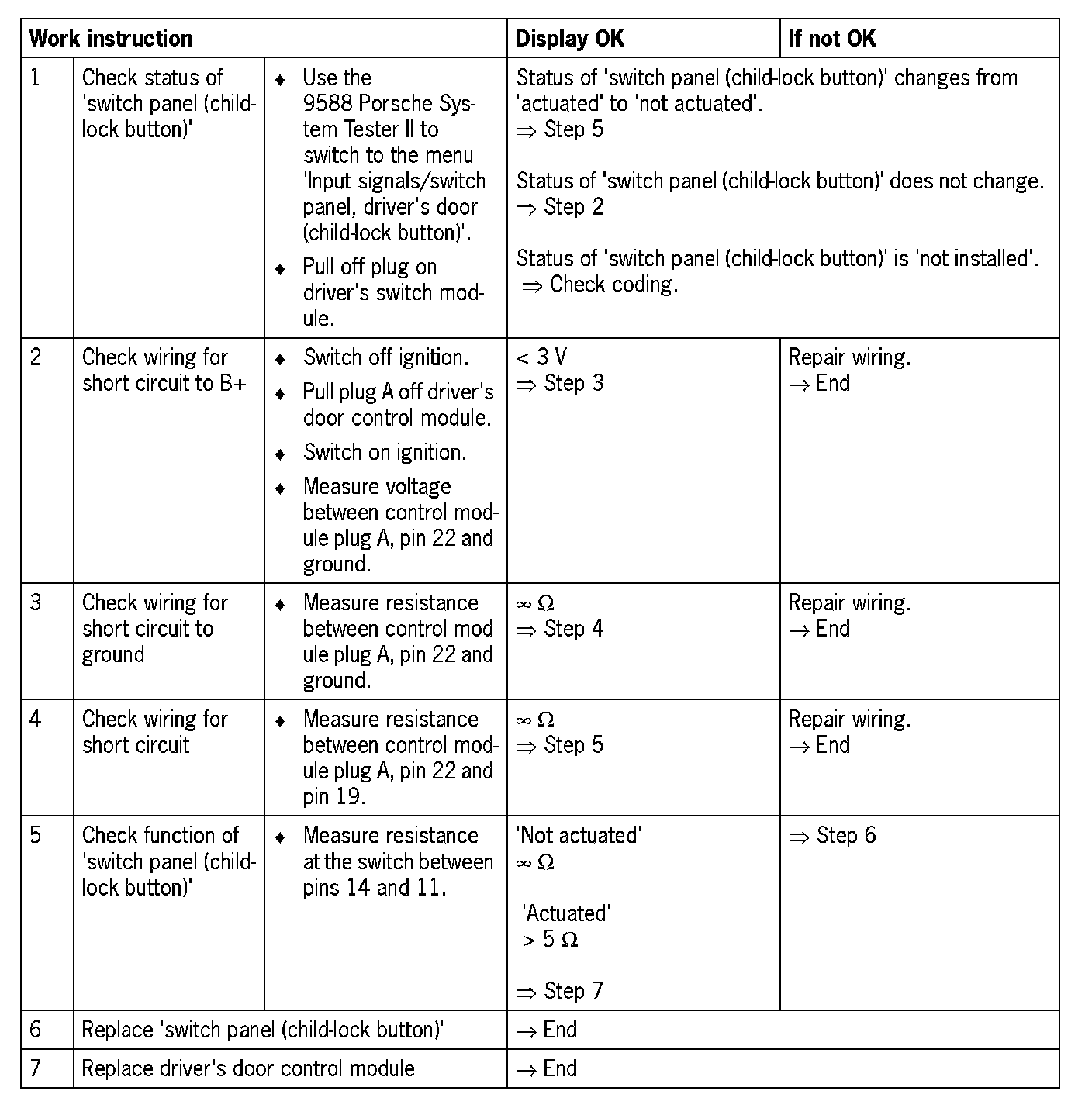 Visual inspection: In the next troubleshooting section, please check first that the affected pins on the driver's door control module plug connection are neither damaged nor corroded. The wiring and plugs of the affected components must also be checked for external damage and correct contacts. Repair damaged or corroded pins if possible, otherwise replace affected pins. Repair or replace damaged wires.
