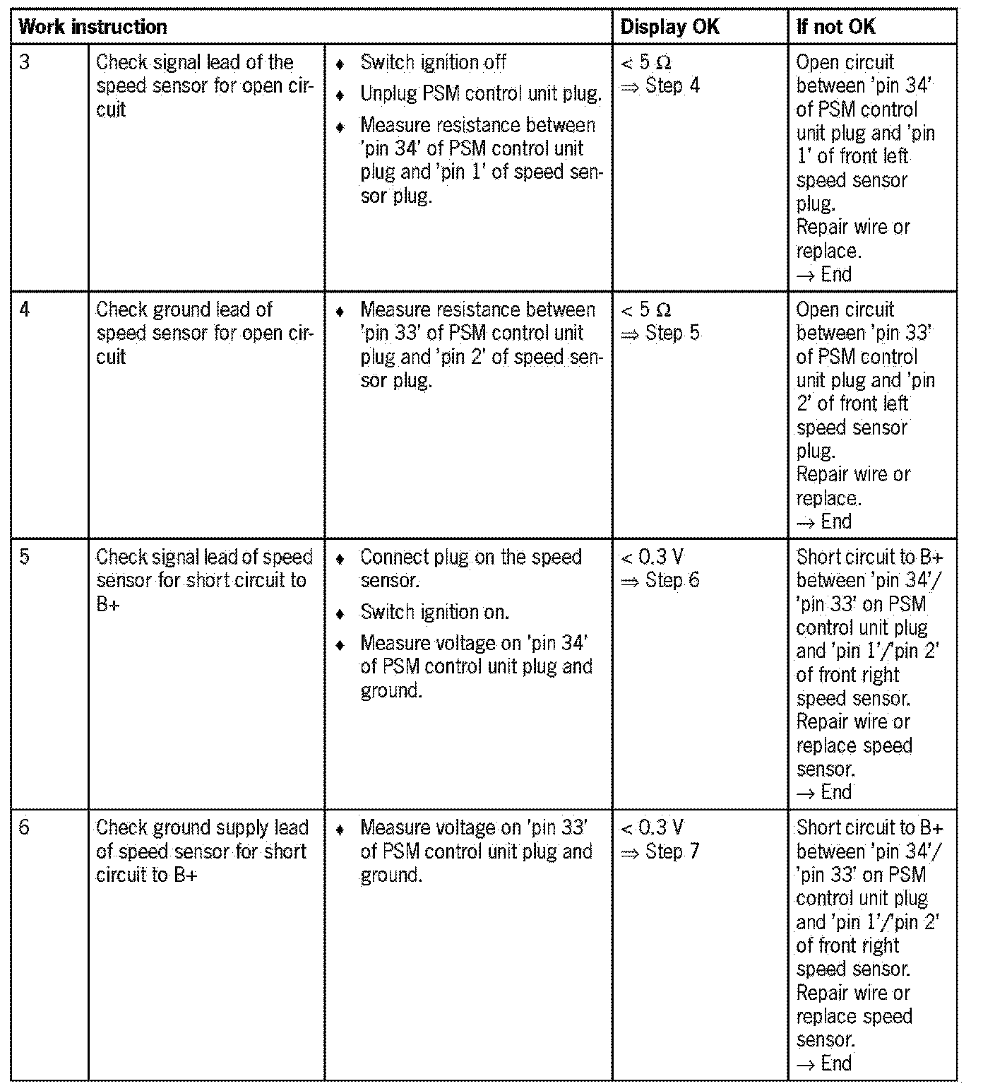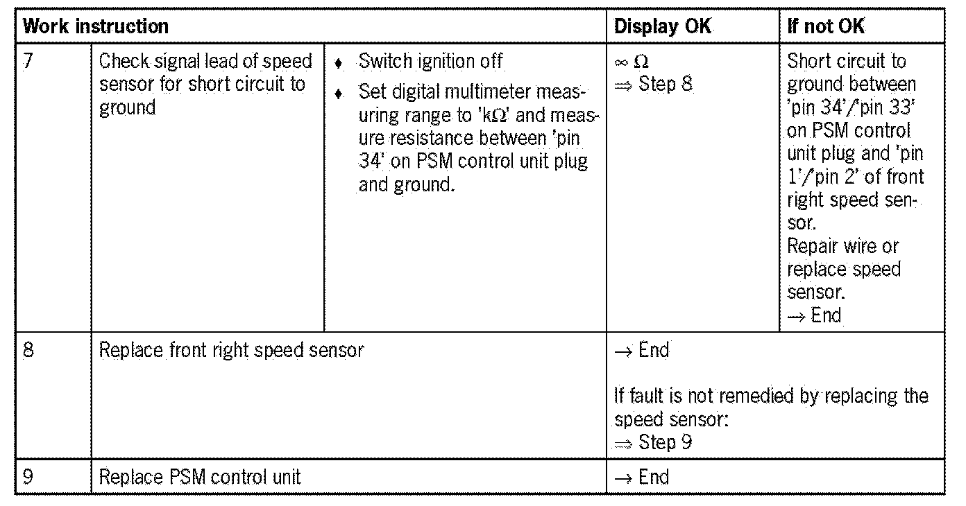 Visual inspection: In the next troubleshooting section, please check first that the affected 'pins' on the PSM control unit plug connection and the 'pins' on the speed sensor plug connection are neither damaged nor corroded. Check the speed sensor, multiple-pole ring on the wheel bearing and the front right wire for external damage. Remove any soiling or corrosion/oxidation. Replace damaged parts. Cables '12/13/35' from measurement tool set No. 9684 are needed for measuring the current on the speed sensor.