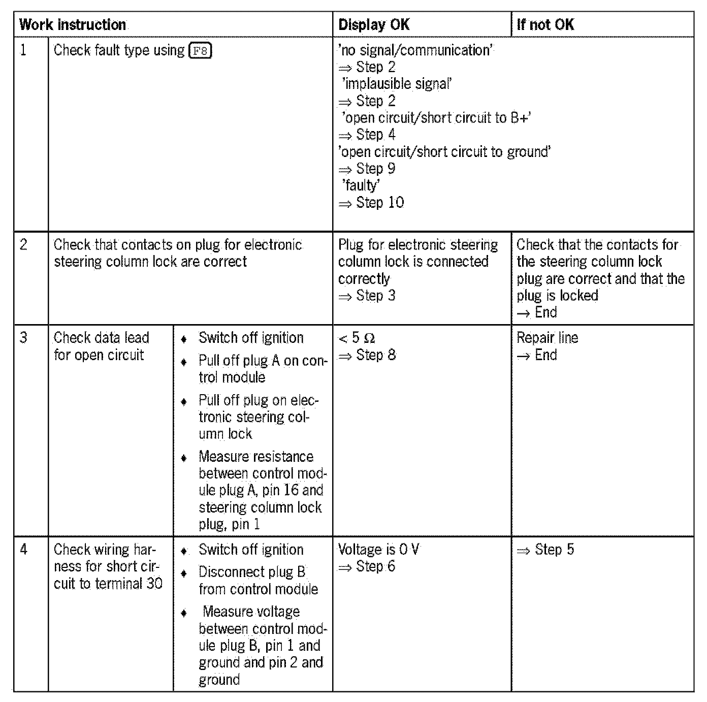 NOTE: Conventional diagnosis/troubleshooting cannot be performed for the fault type 'short circuit to B+', which is displayed using the 'F8' key in the 9588 Porsche System Tester II. The reason for this is that the ignition cannot be switched on when there is no control module connected. As a result, it is not possible to differentiate uniquely between a short circuit to terminal 30 and a short circuit to terminal 15. A thorough visual inspection of components and wiring must therefore be carried out before replacing a control module.