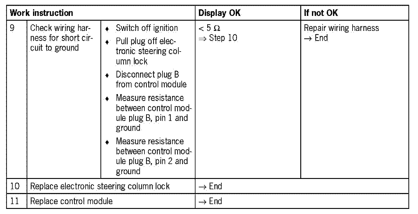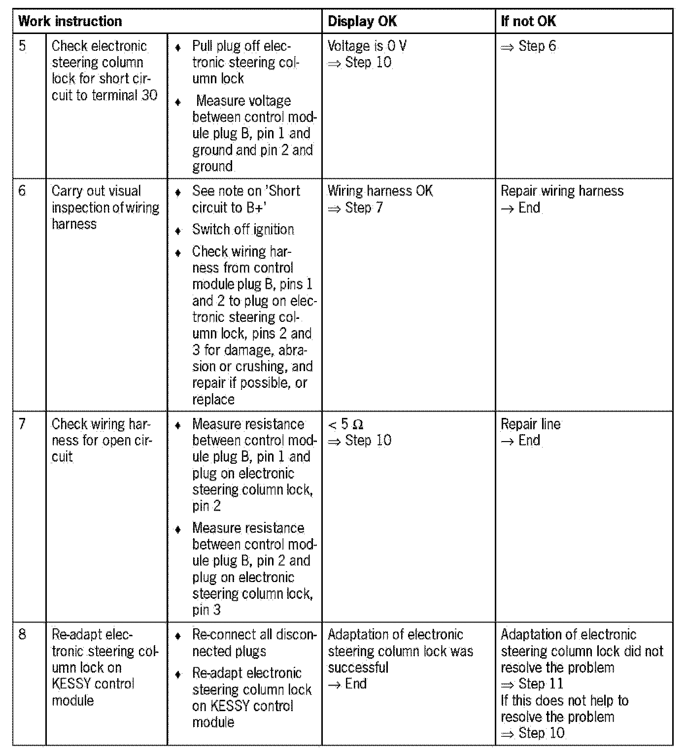 Visual inspection: In the next troubleshooting section, please check first that the affected pins on the KESSY control module plug connection are neither damaged nor corroded. The wiring and plugs of the affected components must also be checked for external damage and correct contacts. Repair damaged or corroded pins if possible, otherwise replace affected pins. Repair or replace damaged wires.