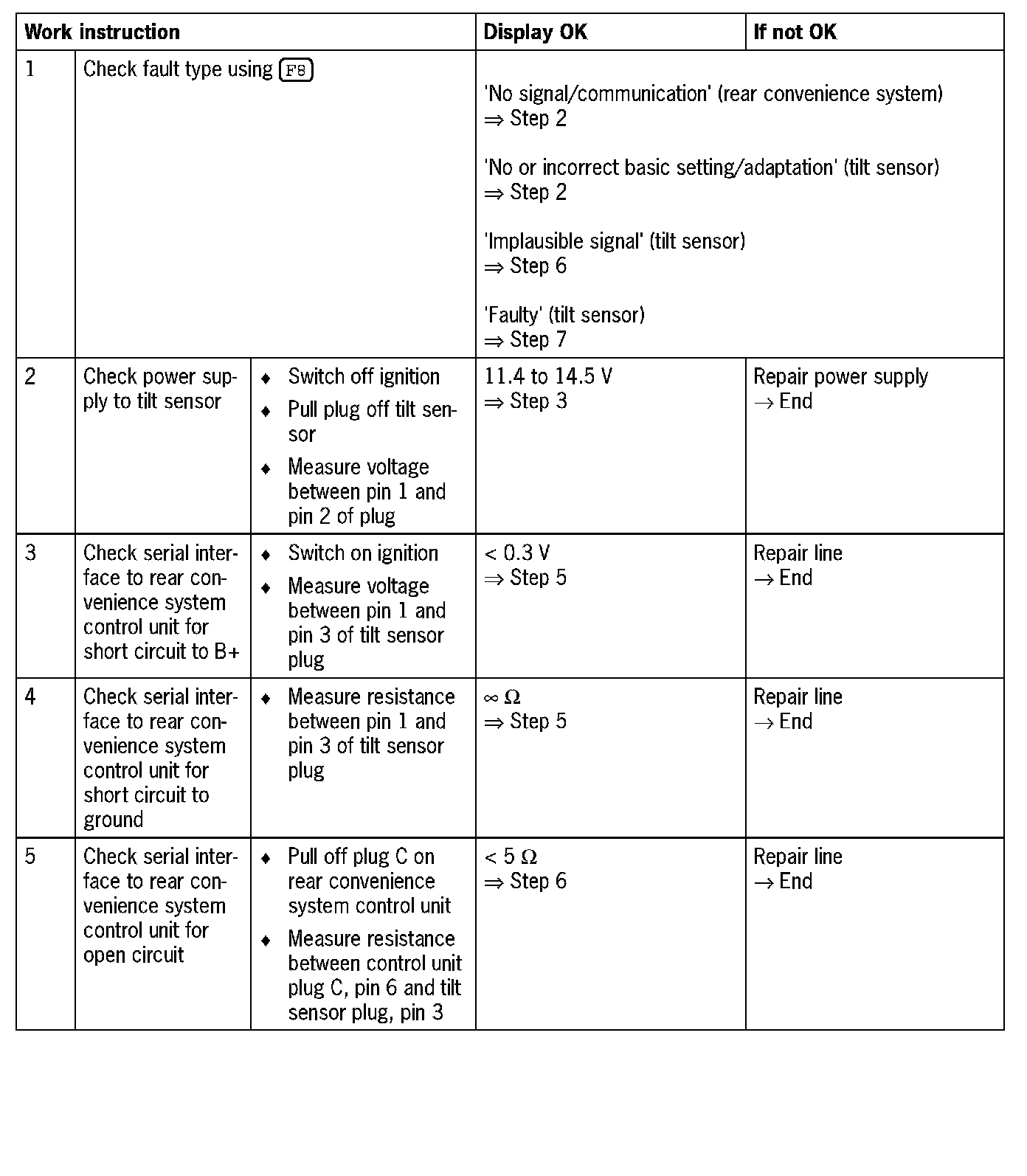 Visual inspection: In the next troubleshooting section, please check first that the affected pins on the rear convenience system control unit plug connection are neither damaged nor corroded. The wiring and plugs of the affected components must also be checked for external damage and proper contact Repair damaged or corroded pins it possible, otherwise replace affected pins. Repair or replace damaged wires.