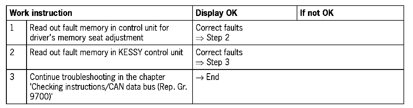 Visual inspection: In the next troubleshooting section, first check that the affected pins on the driver's memory seat adjustment control unit plug connection are not damaged or corroded. The wiring and plugs of the affected components must also be checked for external damage and correct contact. Repair damaged or corroded pins if possible, otherwise replace affected pins. Repair or replace damaged wires.