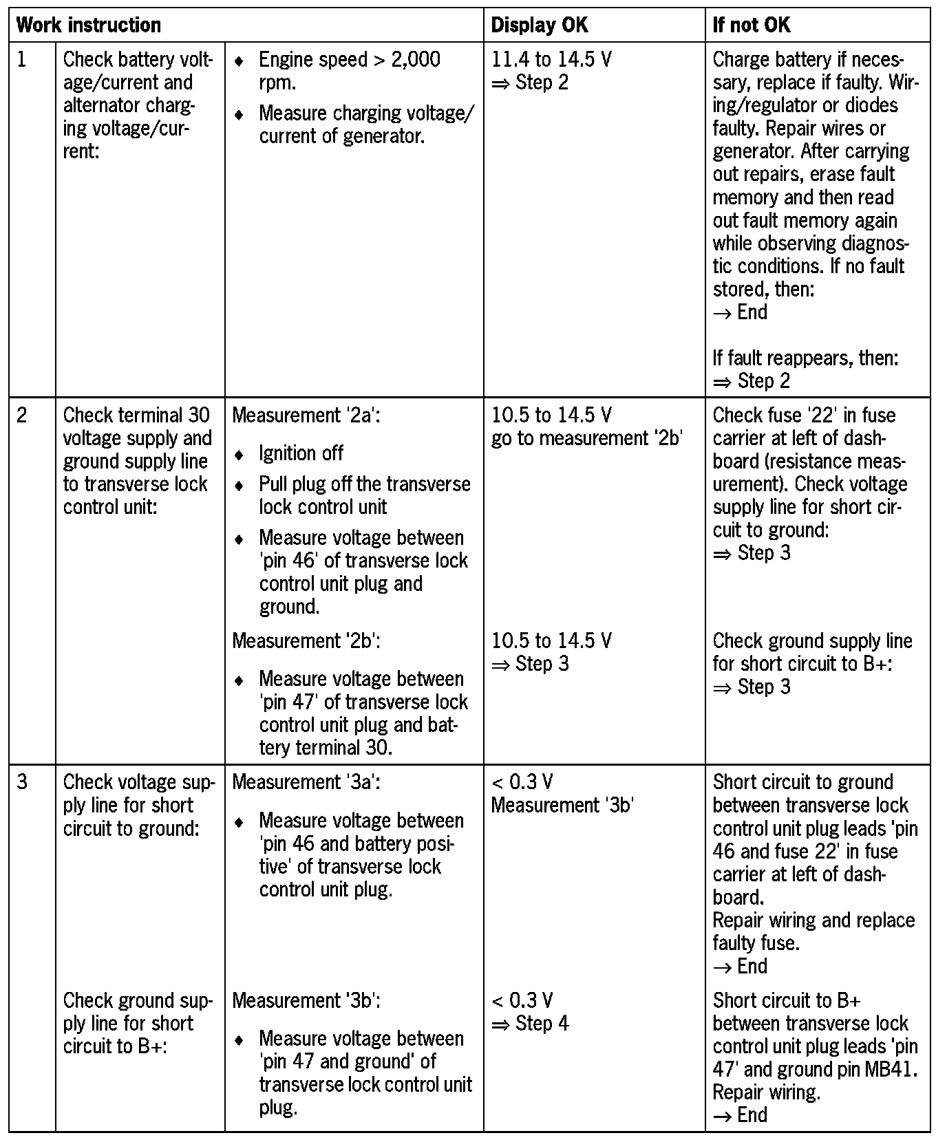 Before carrying out the work instruction, please check fuse '22', terminal 30 power supply for the transverse lock control unit, in the fuse carrier at the left of the dashboard and replace it if necessary. After replacing the fuse, determine and remedy the cause of the fault in accordance with the work instruction below.