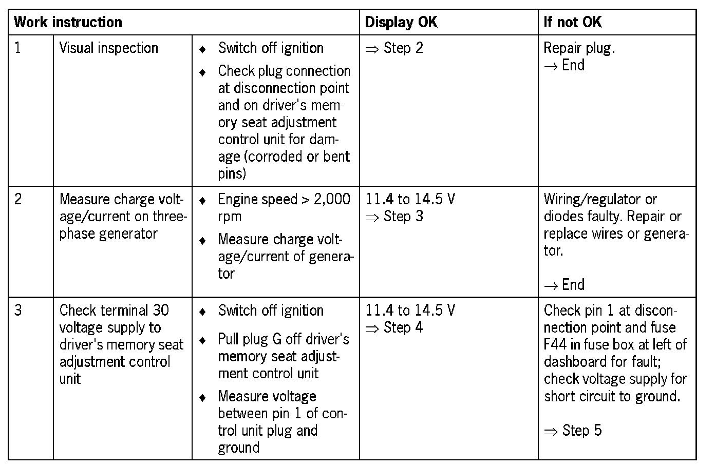 Visual inspection: In the next troubleshooting section, first check that the affected pins on the driver's memory seat adjustment control unit plug connection are not damaged or corroded. The wiring and plugs of the affected components must also be checked for external damage and correct contact. Repair damaged or corroded pins if possible, otherwise replace affected pins. Repair or replace damaged wires.