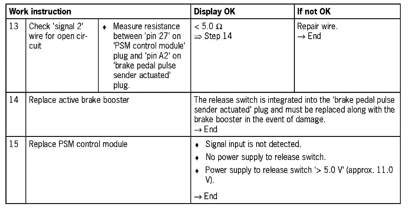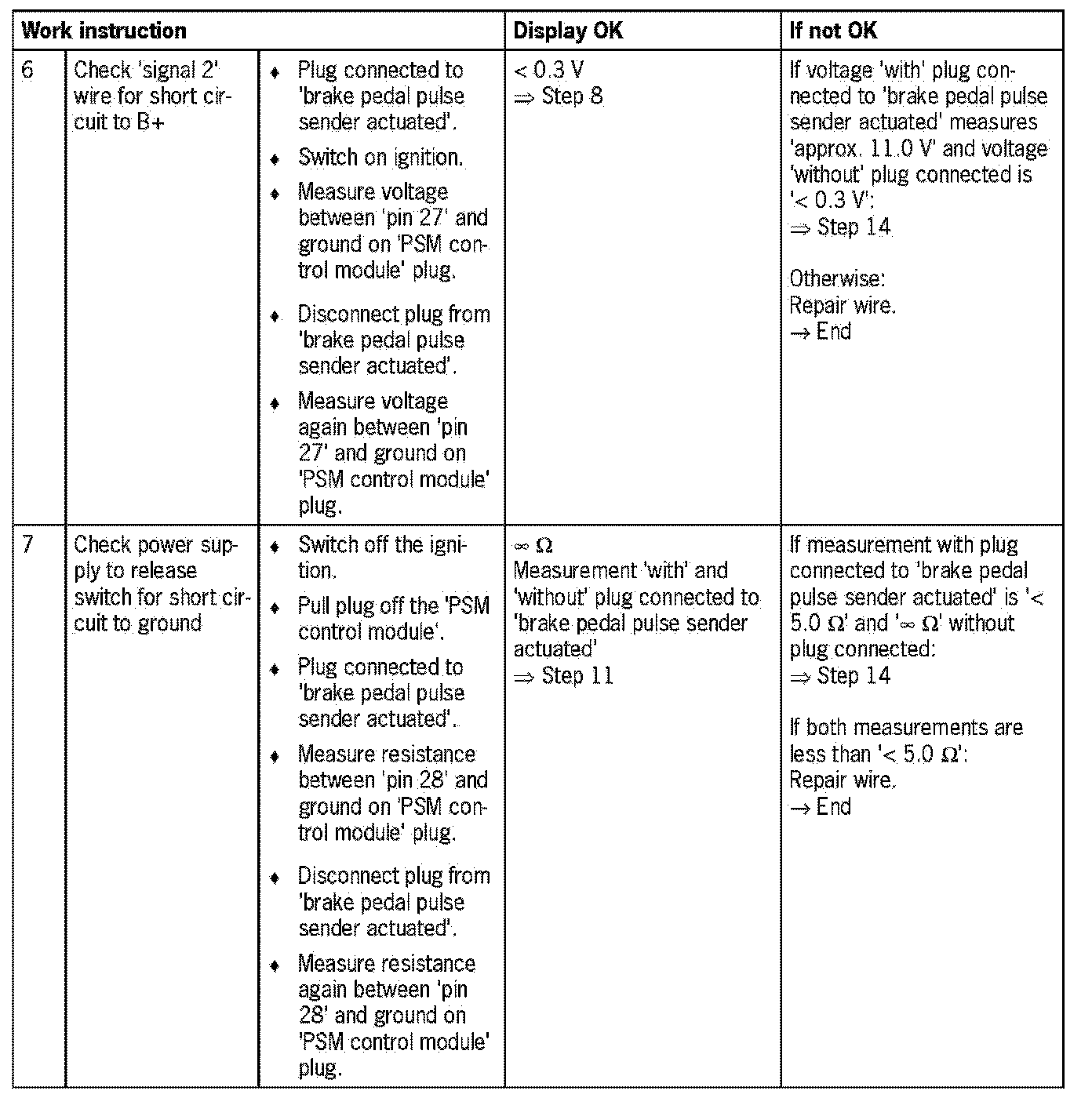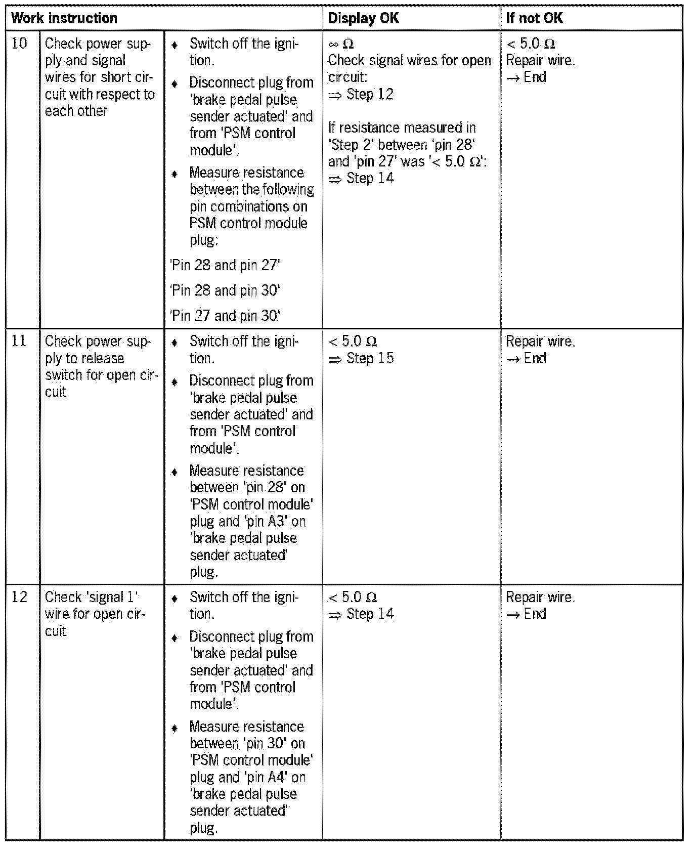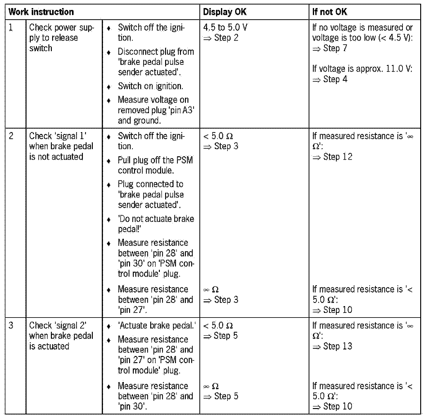 Visual inspection: In the next troubleshooting section, please check first that the affected 'pins' on the PSM control module plug connection and the 'pins' on the 'brake pedal pulse sender actuated' plug connection are neither damaged nor corroded. The wiring of the affected components must also be checked for external damage. Repair damaged or corroded pins if possible, otherwise replace affected 'pins'. Repair or replace damaged wire.