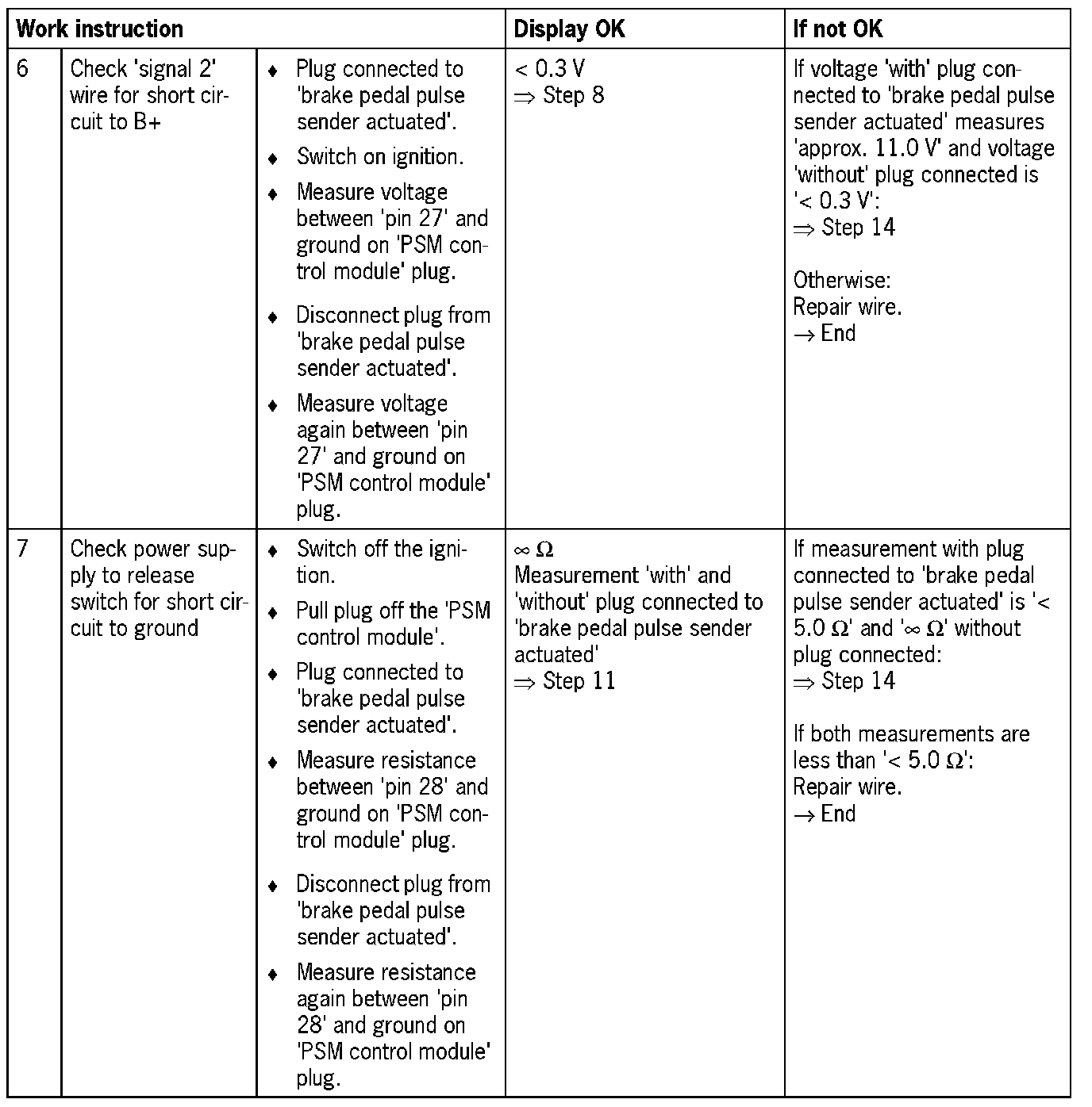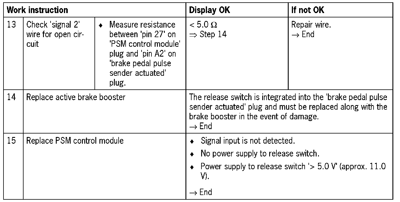 NOTE: Visual inspection: In the next troubleshooting section, please check first that the affected 'pins' on the PSM control module plug connection and the 'pins' on the 'brake pedal pulse sender actuated' plug connection are neither damaged nor corroded. The wiring of the affected components must also be checked for external damage. Repair damaged or corroded 'pins' if possible, otherwise replace affected 'pins'. Repair or replace damaged wire.