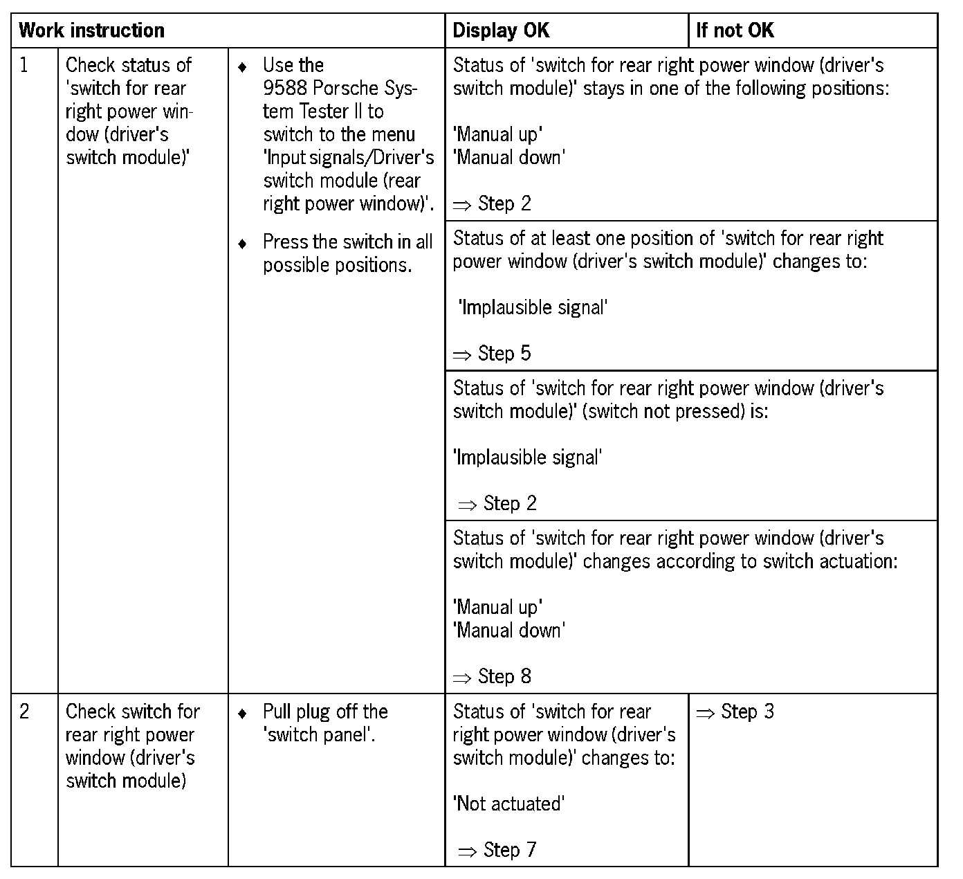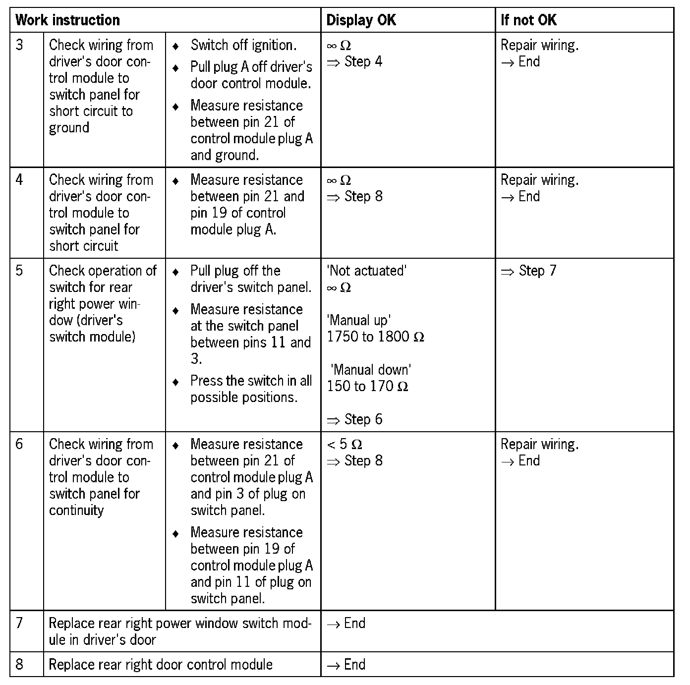 Visual inspection: In the next troubleshooting section, please check first that the affected pins on the driver's door control module plug connection are neither damaged nor corroded. The wiring and plugs of the affected components must also be checked for external damage and correct contacts. Repair damaged or corroded pins if possible, otherwise replace affected pins. Repair or replace damaged wires.