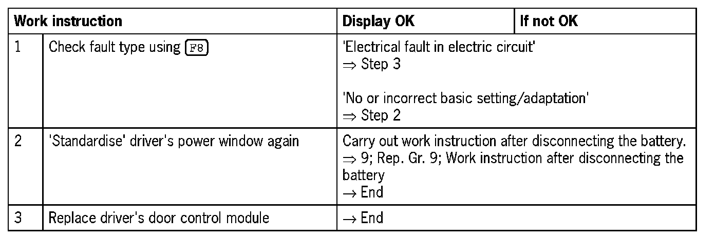 Visual inspection: In the next troubleshooting section, please check first that the affected pins on the driver's door control module plug connection are neither damaged nor corroded. The wiring and plugs of the affected components must also be checked for external damage and correct contacts. Repair damaged or corroded pins if possible, otherwise replace affected pins. Repair or replace damaged wires.