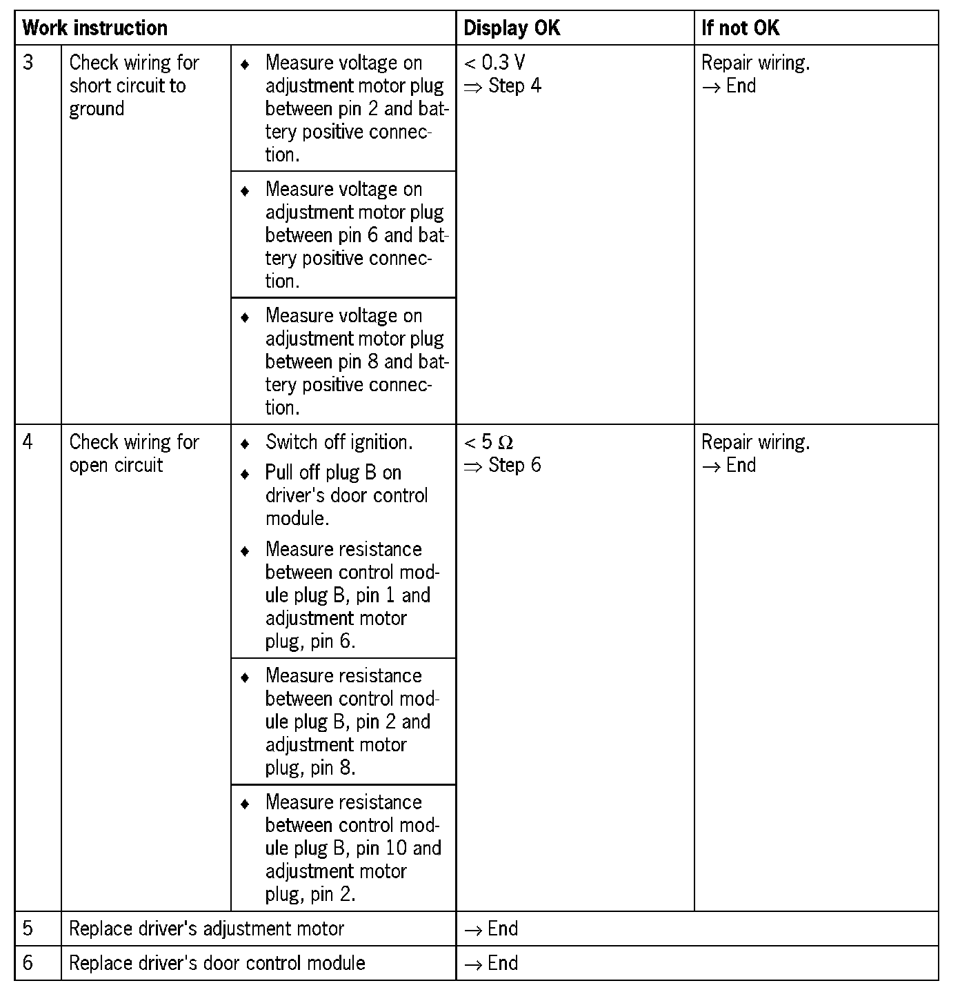 Visual inspection: In the next troubleshooting section, please check first that the affected pins on the driver's door control module plug connection are neither damaged nor corroded. The wiring and plugs of the affected components must also be checked for external damage and correct contacts. Repair damaged or corroded pins if possible, otherwise replace affected pins. Repair or replace damaged wires.