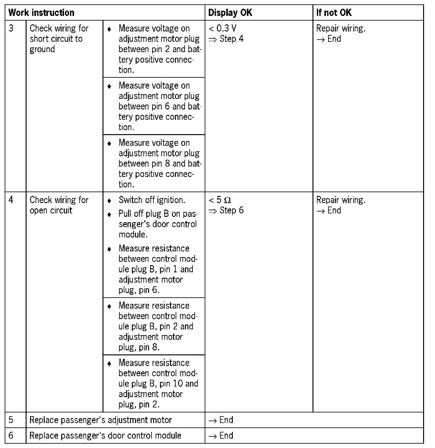 Visual inspection: In the next troubleshooting section, please check first that the affected pins on the passenger's door control module plug connection are neither damaged nor corroded. The wiring and plugs of the affected components must also be checked for external damage and correct contacts. Repair damaged or corroded pins if possible, otherwise replace affected pins. Repair or replace damaged wires.