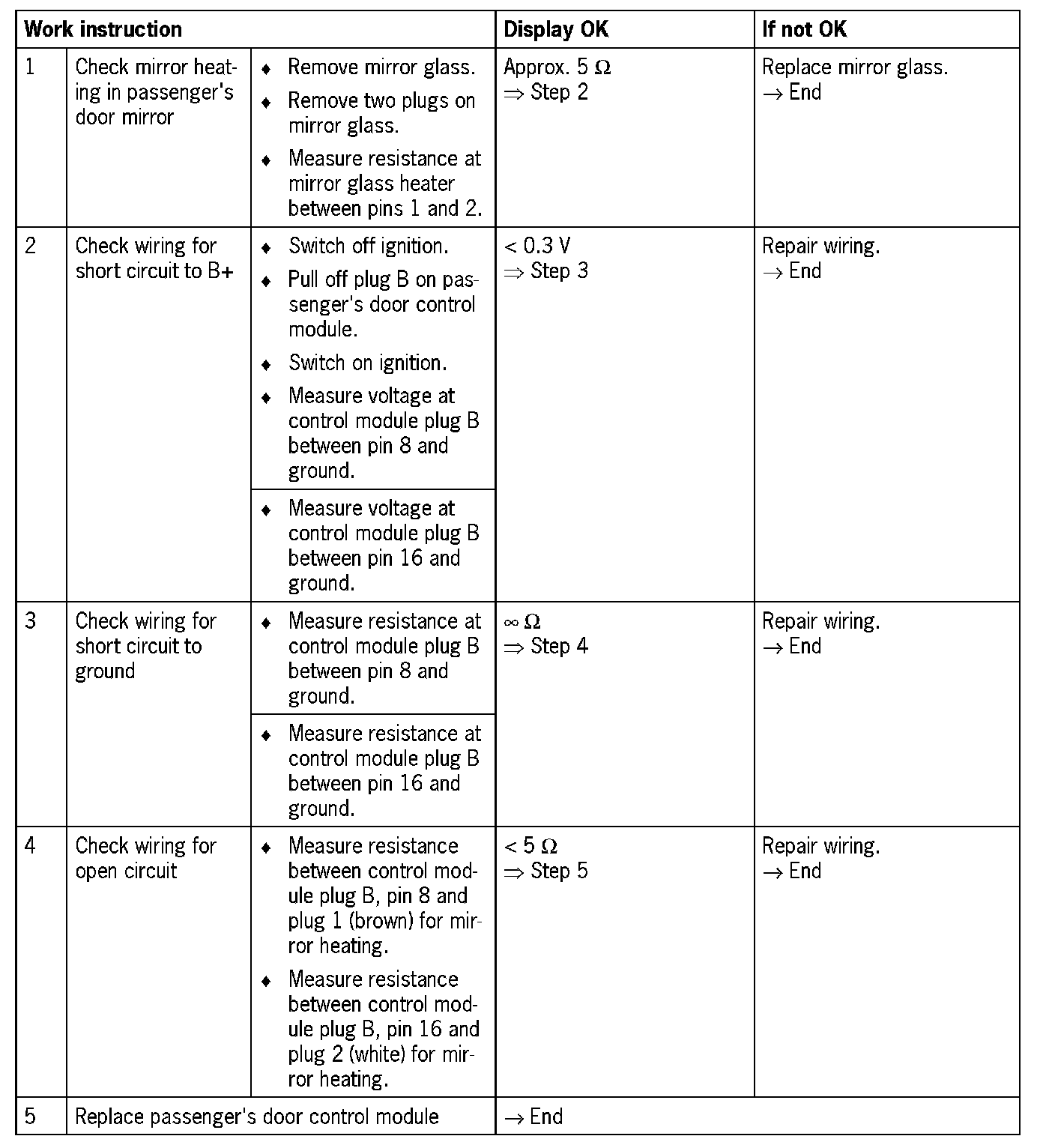 Visual inspection: In the next troubleshooting section, please check first that the affected pins on the passenger's door control module plug connection are neither damaged nor corroded. The wiring and plugs of the affected components must also be checked for external damage and correct contacts. Repair damaged or corroded pins if possible, otherwise replace affected pins. Repair or replace damaged wires.