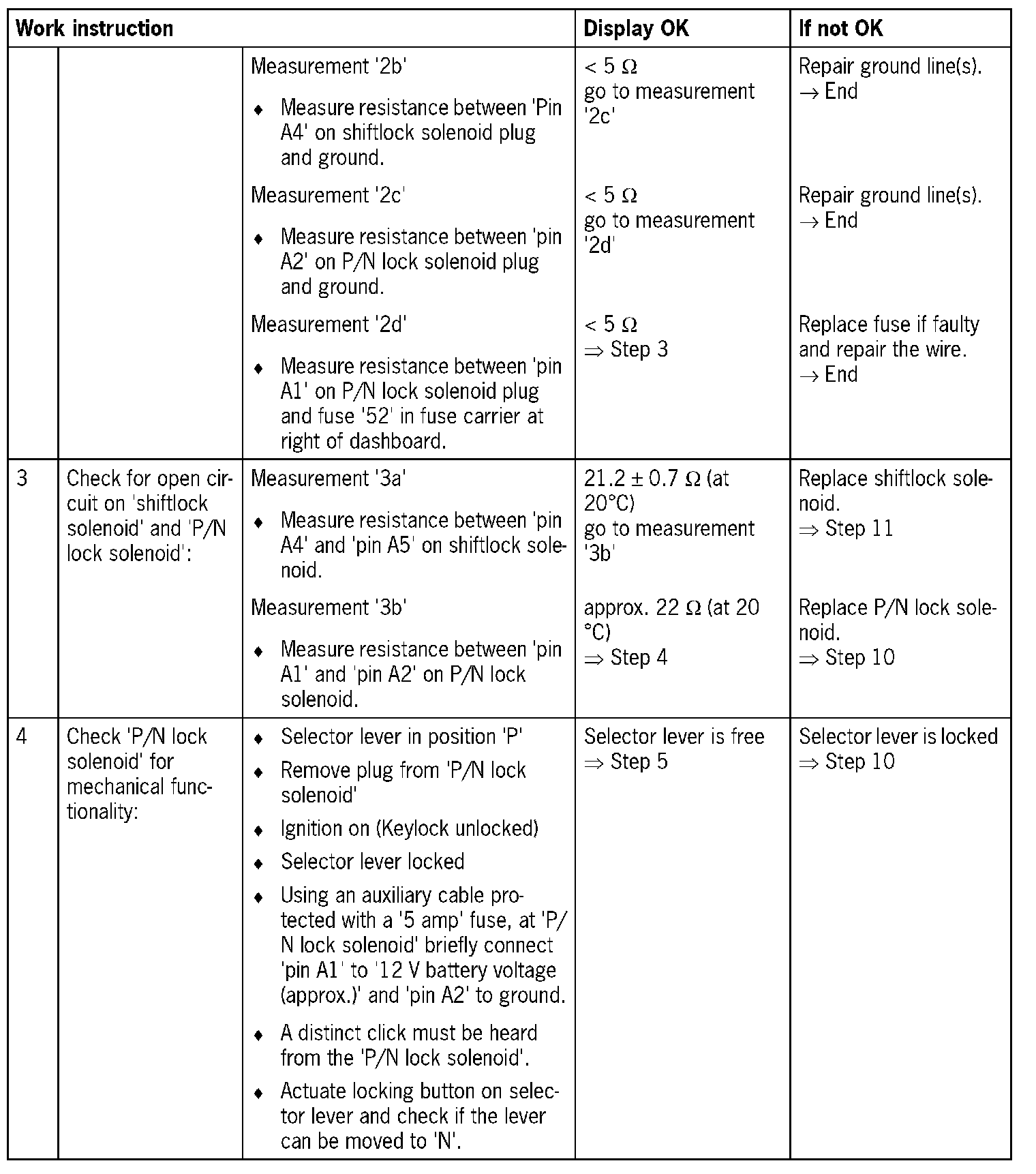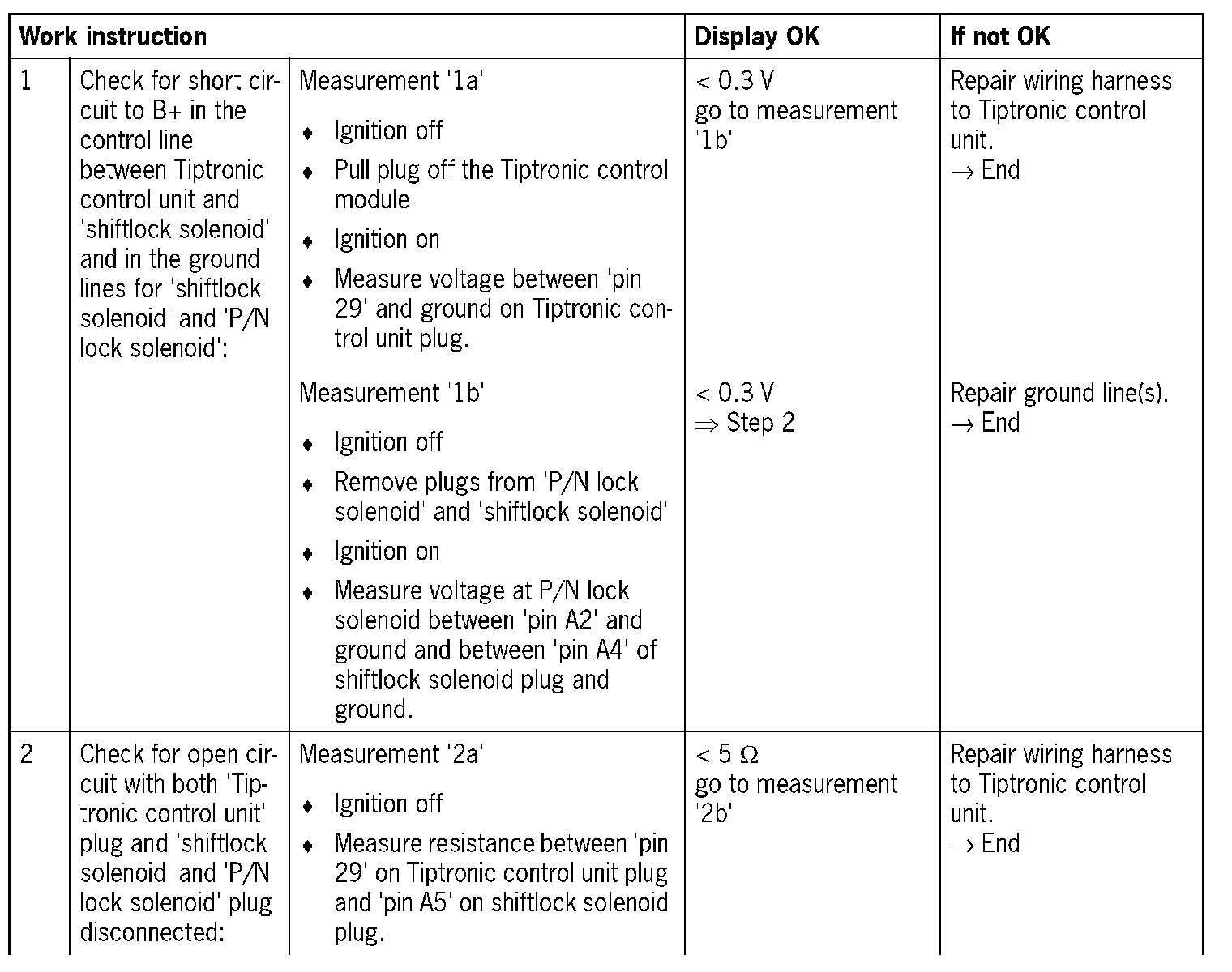 - 1. 'Open circuit/short circuit to B+': In the event of open circuit, shiftlock solenoid not activated