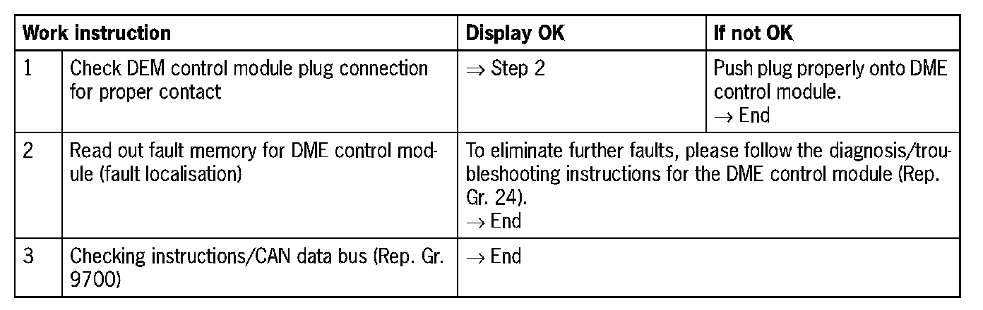 - 'Please read out fault memory': to localise fault, read out fault memory for 'DME control module'