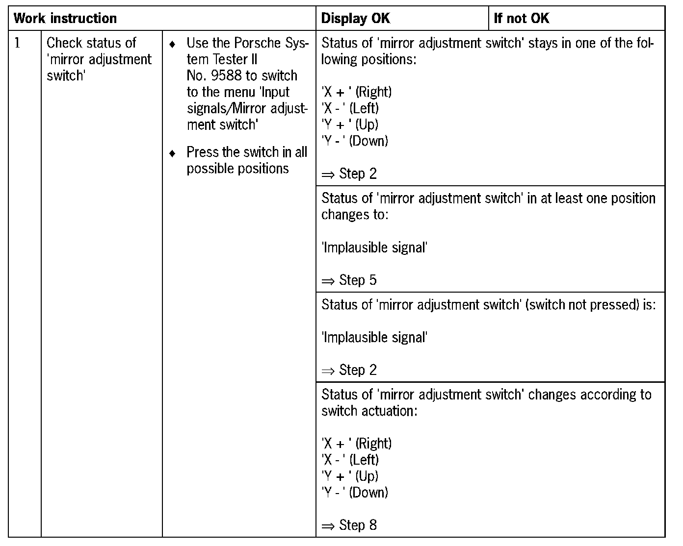 NOTE: The following diagnosis/troubleshooting should be performed with the mirror adjustment switch in position A (driver's door mirror) and position B (passenger's door mirror).