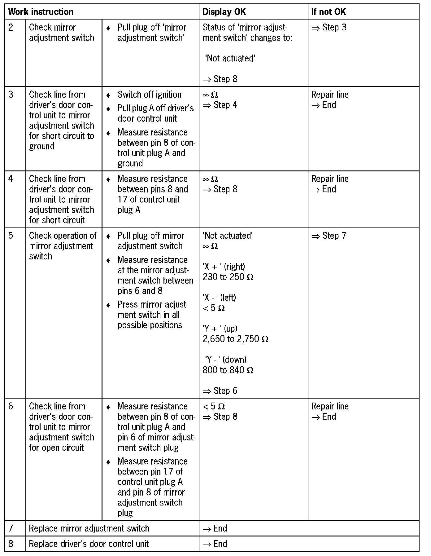 Visual inspection: In the next troubleshooting section, please check first that the affected pins on the driver's door control unit plug connection are neither damaged nor corroded. The wiring and plugs of the affected components must also be checked for external damage and proper contact Repair damaged or corroded pins it possible, otherwise replace affected pins. Repair or replace damaged wires.