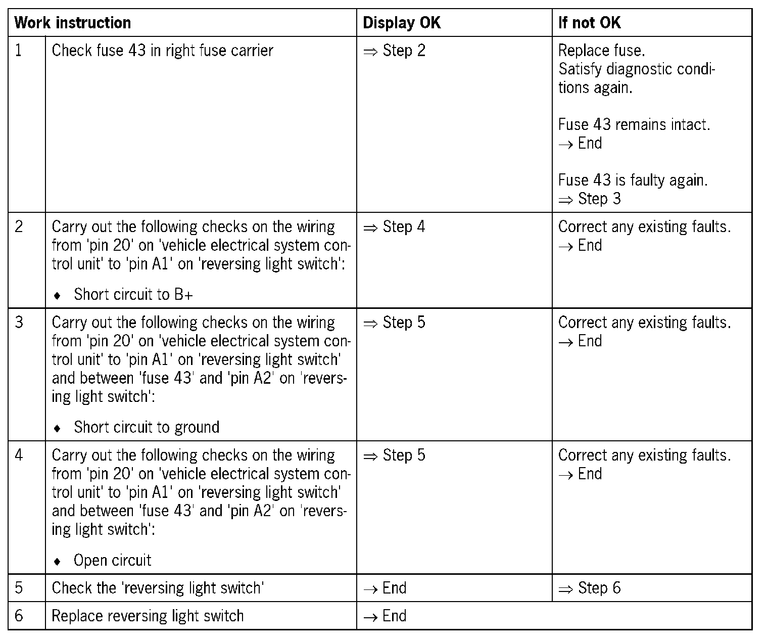 The 'reversing light switch' electric circuit may have one of the following faults: