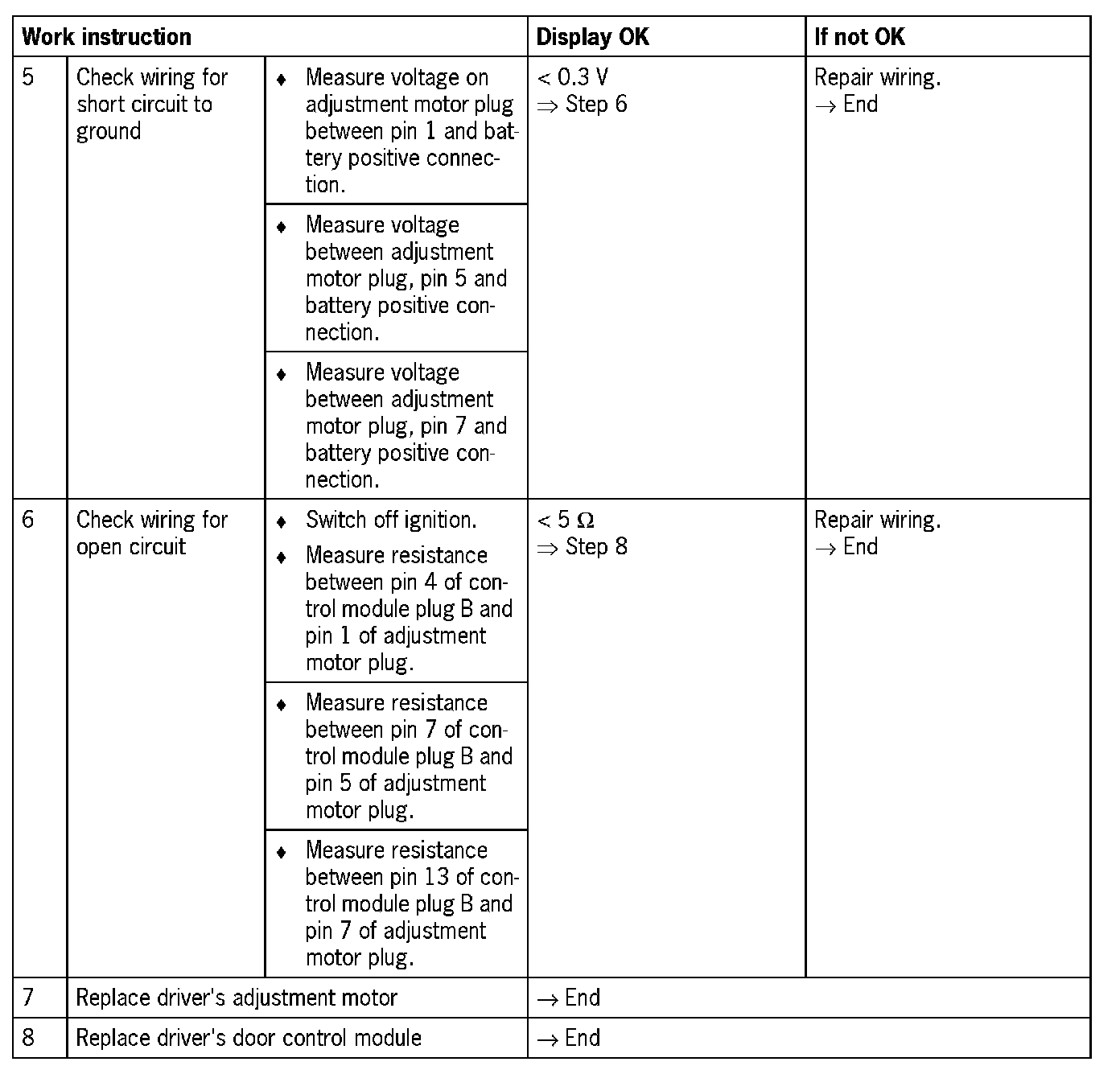 Visual inspection: In the next troubleshooting section, please check first that the affected pins on the driver's door control module plug connection are neither damaged nor corroded. The wiring and plugs of the affected components must also be checked for external damage and correct contacts. Repair damaged or corroded pins if possible, otherwise replace affected pins. Repair or replace damaged wires.
