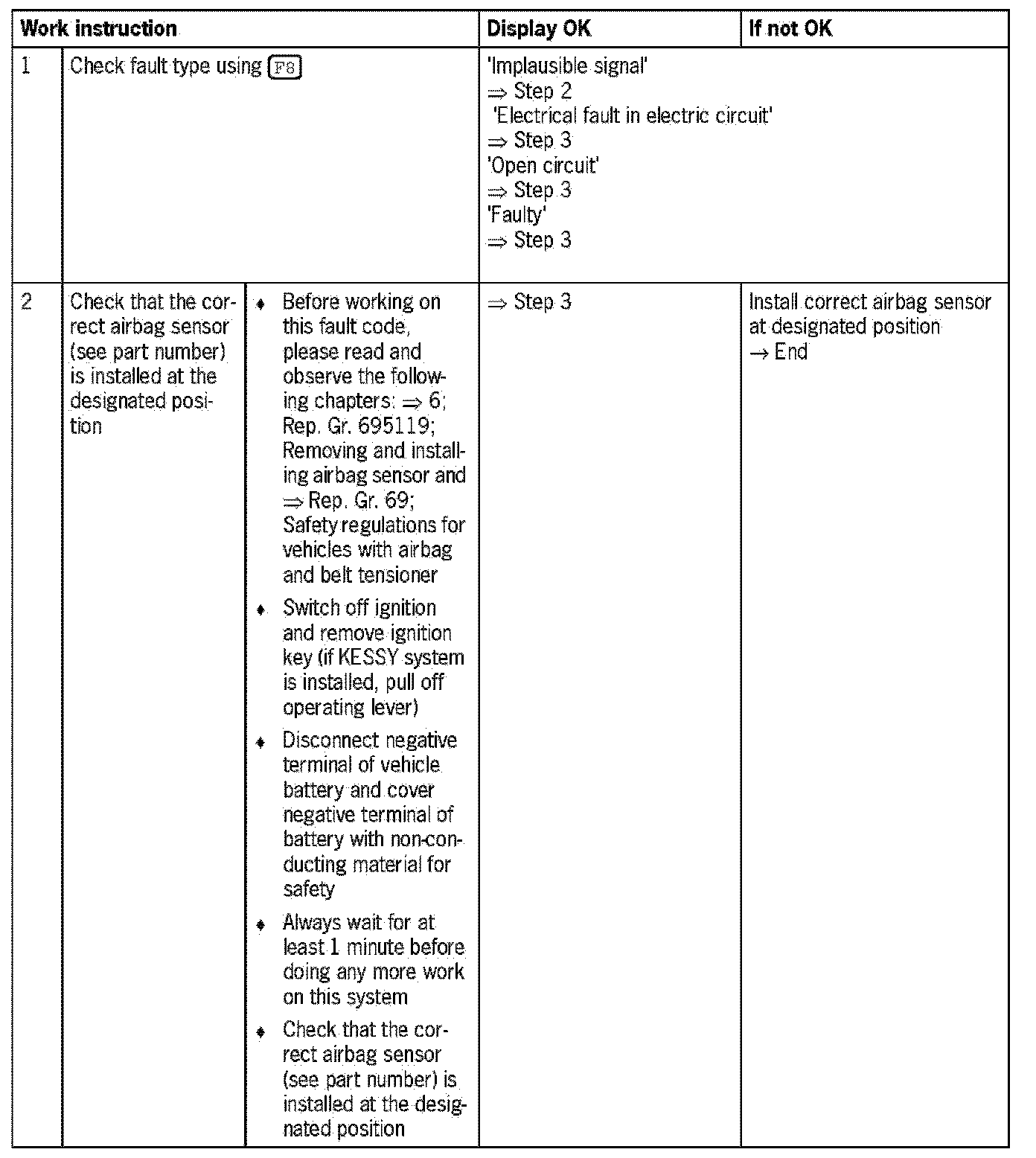 - Electrical fault in electric circuit (based on wiring between airbag triggering unit and airbag sensor; probably a short circuit to B+ or a short circuit to ground)
