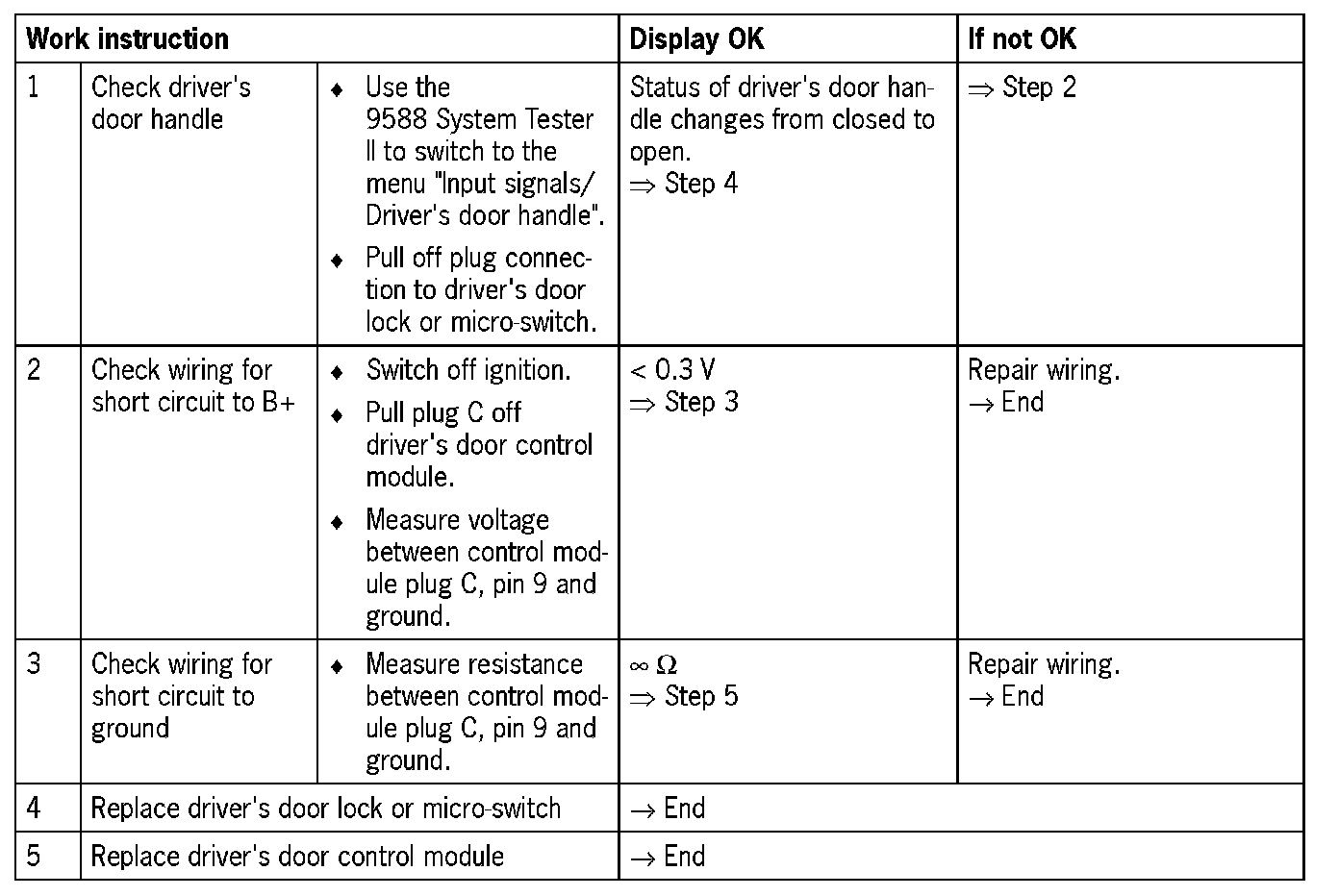 Visual inspection: In the next troubleshooting section, please check first that the affected pins on the driver's door control module plug connection are neither damaged nor corroded. The wiring and plugs of the affected components must also be checked for external damage and correct contacts. Repair damaged or corroded pins if possible, otherwise replace affected pins. Repair or replace damaged wires.