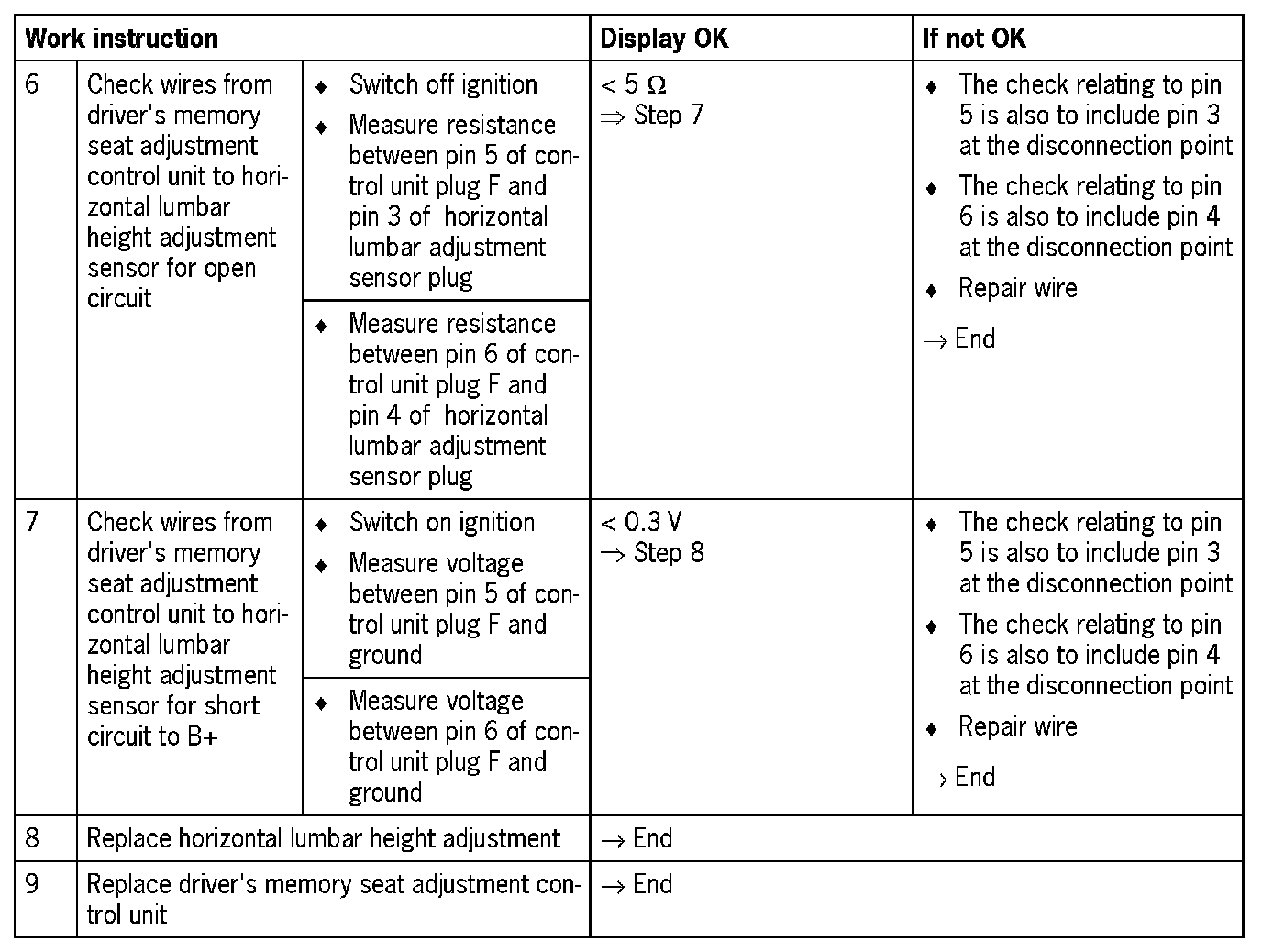 Visual inspection: In the next troubleshooting section, first check that the affected pins on the driver's memory seat adjustment control unit plug connection are not damaged or corroded. The wiring and plugs of the affected components must also be checked for external damage and correct contact. Repair damaged or corroded pins if possible, otherwise replace affected pins. Repair or replace damaged wires.