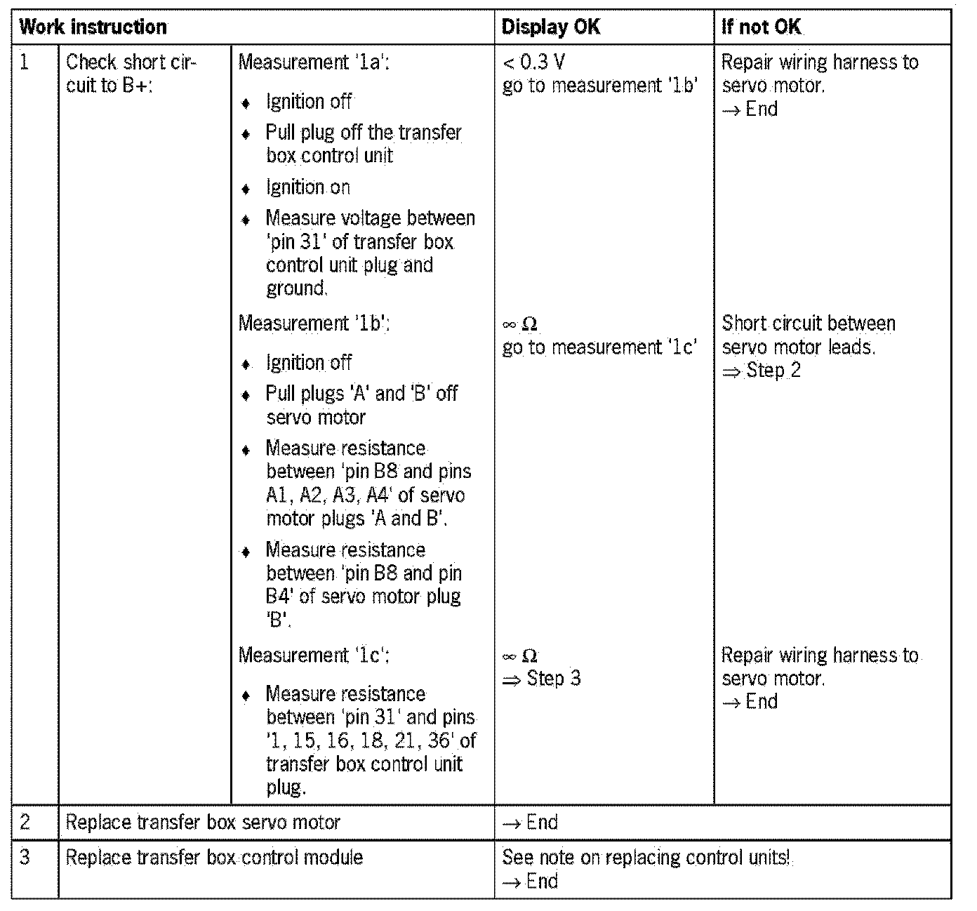 Visual inspection: In the next troubleshooting section, please check first that the affected 'pins' of the transfer box control unit plug connection and the 'pins' of the plug connections on the servo motor are neither damaged nor corroded. Remove any soiling or corrosion/ oxidation. Replace damaged parts/wires.