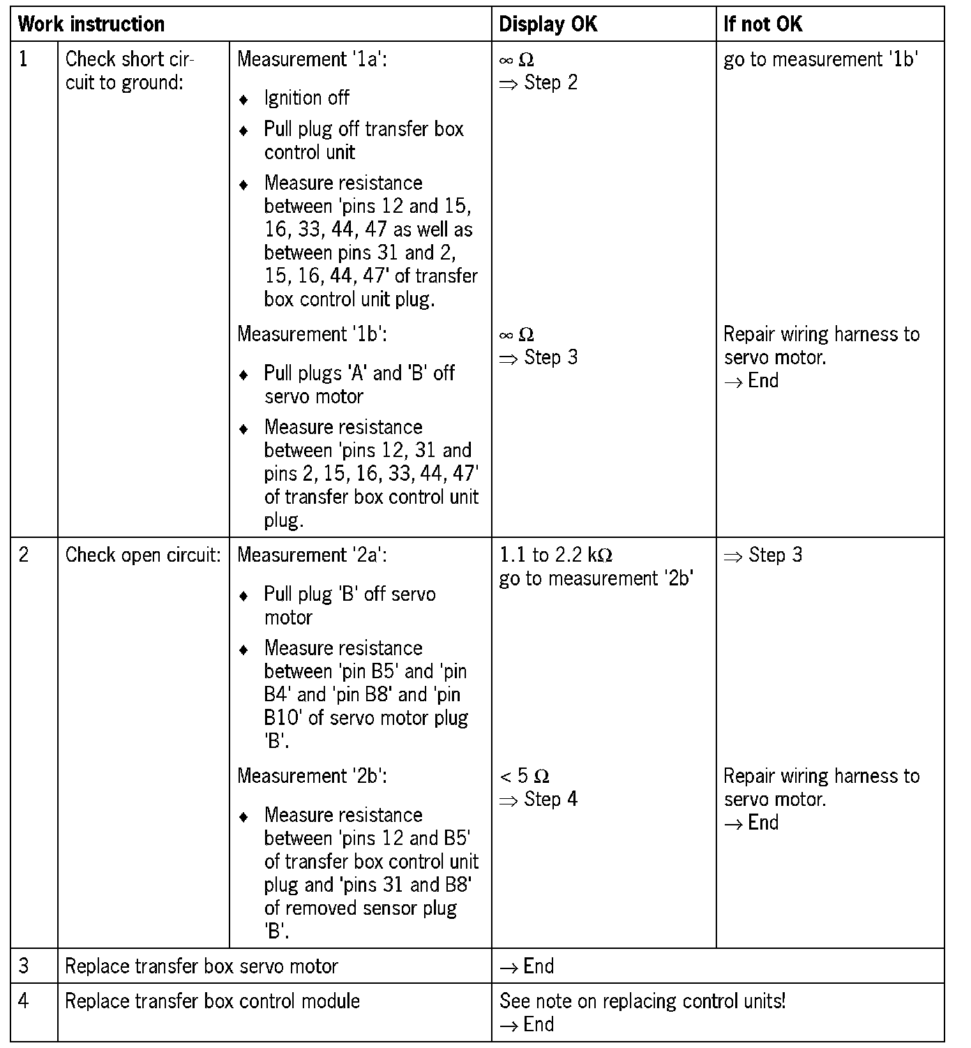- Visual inspection: In the next troubleshooting section, please check first that the affected 'pins' of the transfer box control unit plug connection and the 'pins' of the plug connections on the servo motor are neither damaged nor corroded. Remove any soiling or corrosion/oxidation. Replace damaged parts/wires.