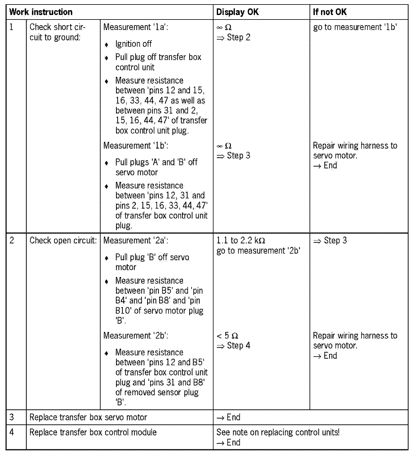 Visual inspection: In the next troubleshooting section, please check first that the affected 'pins' of the transfer box control unit plug connection and the 'pins' of the plug connections on the servo motor are neither damaged nor corroded. Remove any soiling or corrosion/ oxidation. Replace damaged parts/wires.