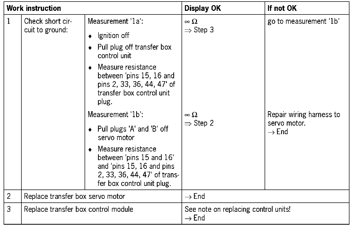- Visual inspection: In the next troubleshooting section, please check first that the affected 'pins' of the transfer box control unit plug connection and the 'pins' of the plug connections on the servo motor are neither damaged nor corroded. Remove any soiling or corrosion/oxidation. Replace damaged parts/wires.