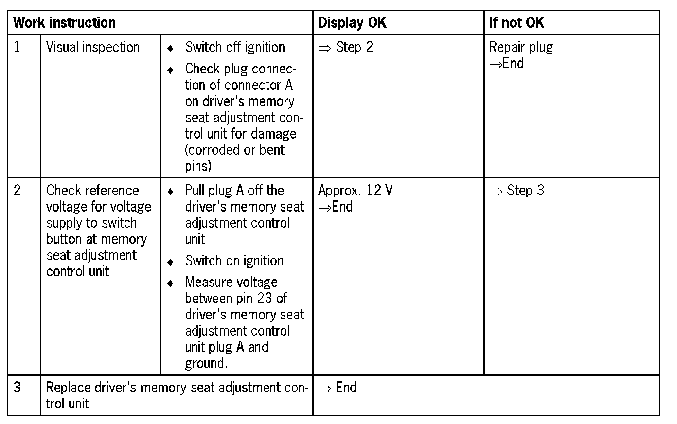 Visual inspection: In the next troubleshooting section, first check that the affected pins on the driver's memory seat adjustment control unit plug connection are not damaged or corroded. The wiring and plugs of the affected components must also be checked for external damage and correct contact. Repair damaged or corroded pins if possible, otherwise replace affected pins. Repair or replace damaged wires.
