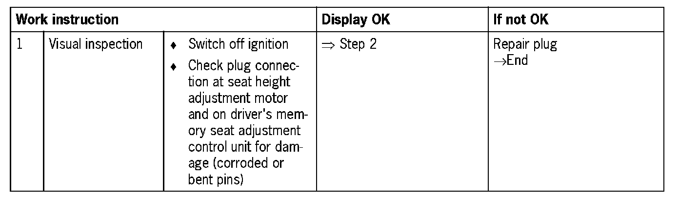 Visual inspection: In the next troubleshooting section, first check that the affected pins on the driver's memory seat adjustment control unit plug connection are not damaged or corroded. The wiring and plugs of the affected components must also be checked for external damage and correct contact. Repair damaged or corroded pins if possible, otherwise replace affected pins. Repair or replace damaged wires.