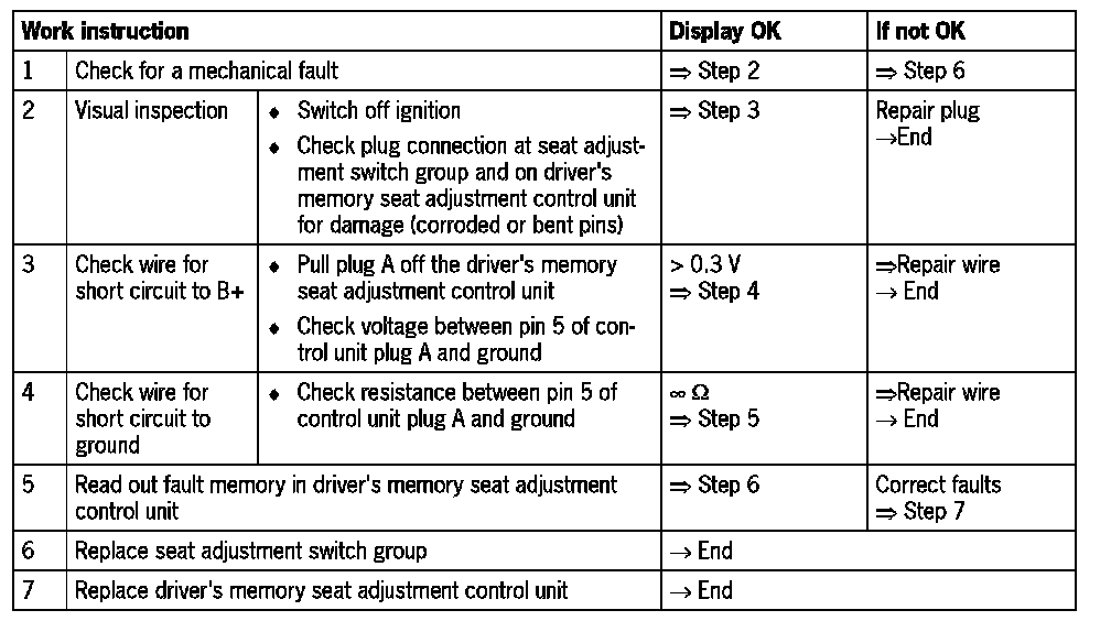 - Visual inspection: In the next troubleshooting section, first check that the affected pins on the driver's memory seat adjustment control unit plug connection are not damaged or corroded. The wiring and plugs of the affected components must also be checked for external damage and correct contact. Repair damaged or corroded pins if possible, otherwise replace affected pins. Repair or replace damaged wires.