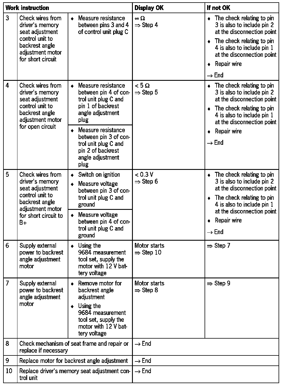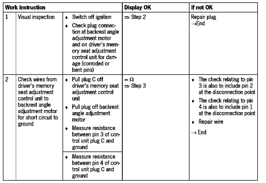 - In the wiring harness from the driver's memory seat adjustment control unit to the backrest angle adjustment motor, there is a disconnection point which must be included in the checks.